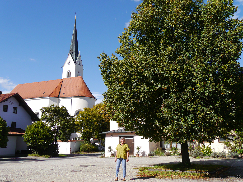 Das an der Goldach gelegene Kirchdorf Schwindkirchen ist der zweitgrößte Gemeindeteil der Stadt Dorfen und liegt an der Ostgrenze des oberbayerischen Landkreises Erding. Bischof Otto von Freising (783 – 810) erwähnte den Ort erstmals urkundlich. Ich durchquere gerade die Stadt und habe nur noch 6 km zu meinem heutigen Ziel, dem Garten von Inge Feckl, in Schwindkirchen, zu absolvieren. Die Katholische Pfarrkirche Mariae Himmelfahrt aus dem Jahre 1785 ist das Schmuckstück des Ortes. Sie steht auf der linken Straßenseite, rechts sind das Wohnhaus und der Familienbetrieb der Familie Feckl. Auf dem großen Vorplatz steht der Hausbaum, eine 35 Jahre alte Linde. Unmittelbar daneben erwartet mich Inge.