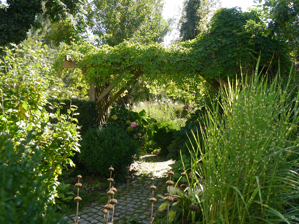 Durch die hölzerne Pforte betreten wir den Garten. Mitte September steht die Sonne nachmittags so schräg, dass sie eine wichtige Rolle in der Gestaltung der Garten-Kulisse übernimmt. Abwechselnd zeichnet sie die Pflanzen weich, dann setzt sie wieder starke Akzente und betont die unterschiedlichen Wuchsformen, rechts und links des Weges. Immer wieder stehe ich entzückt vor neuen Sichtachsen, die das Licht- und Schattenspiel des Nachmittages wiedergeben. Grün ist die dominante Farbe der Malpalette in Inges Gartenreich. So endet das Kopfsteinpflaster auch rasch an der Hausecke und geht in einen unterschiedlich breiten Rasenweg über, der durch den restlichen Garten mäandert.