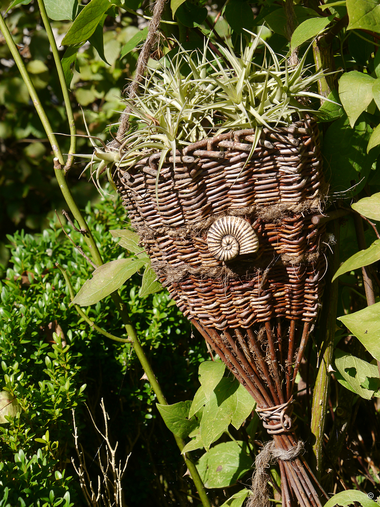 Ich picke einige Nah-Motive auf und halte sie in meinen Fotos fest. Ungewöhnlich sind die unterschiedlichen Weidengeflechte, die Inge, meist mit Material von ihren eigenen Bäumen, fertigt. Egal, ob sie einen länglichen Hängekorb, gefüllt mit Tillandsien, die in Spanien Luftnelken genannt werden, aufhängt, oder zur Straße hin schnell einen niedrigen Flechtzaun fertigt, es ist alles gut durchdacht, schön und praktisch zugleich.
