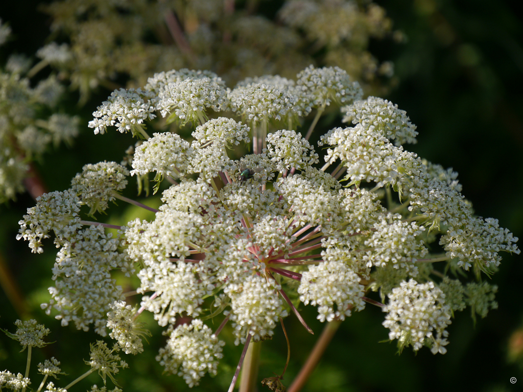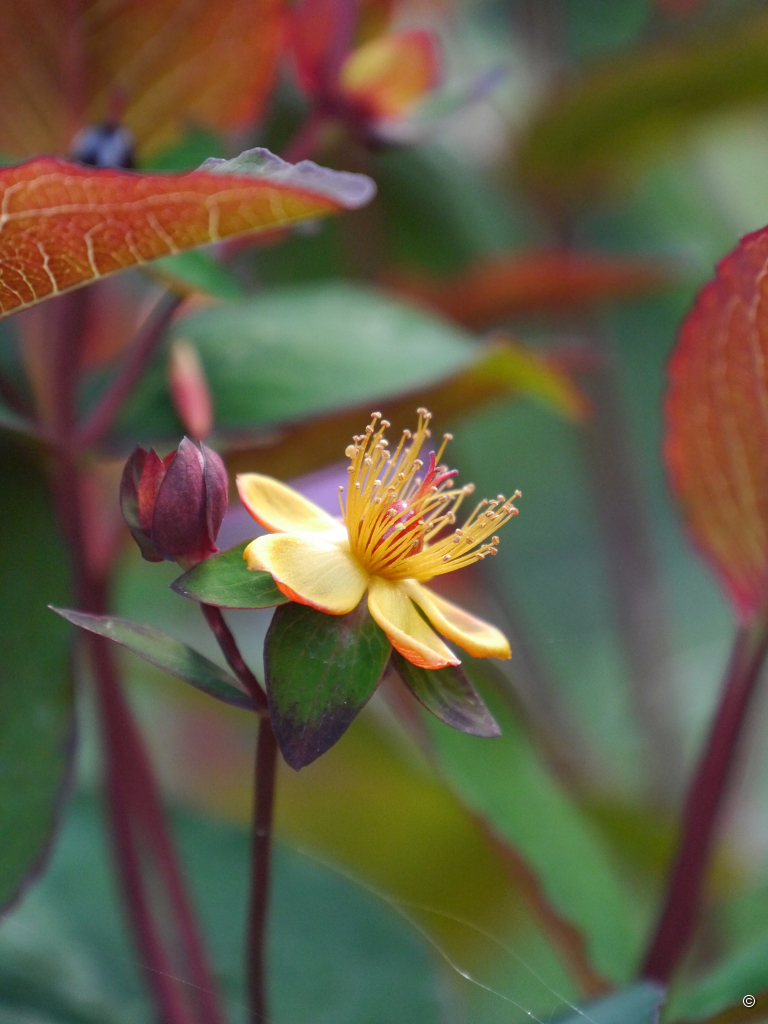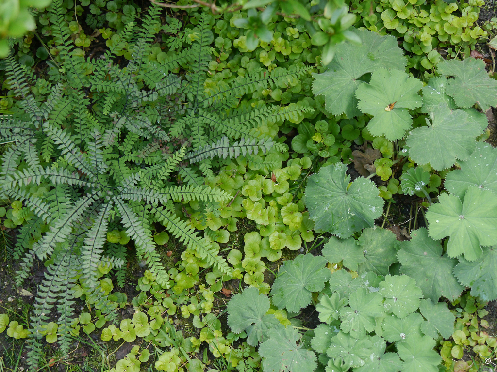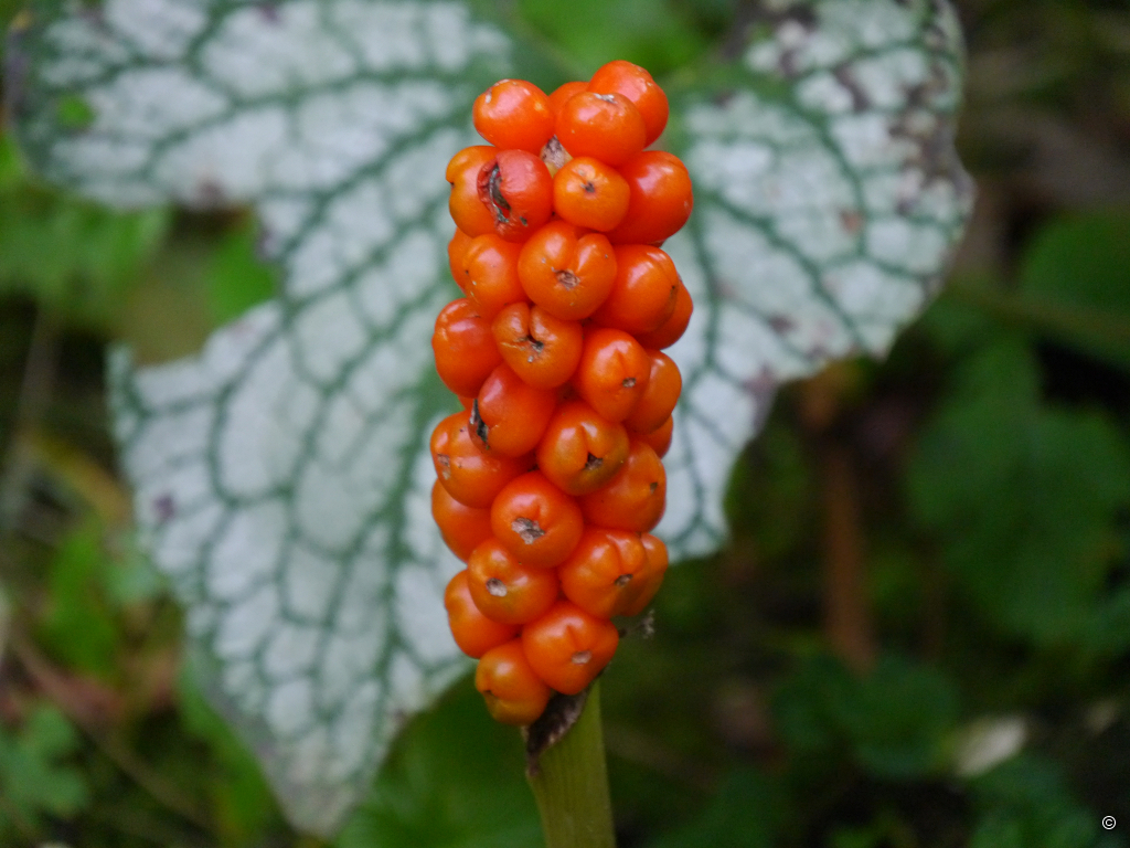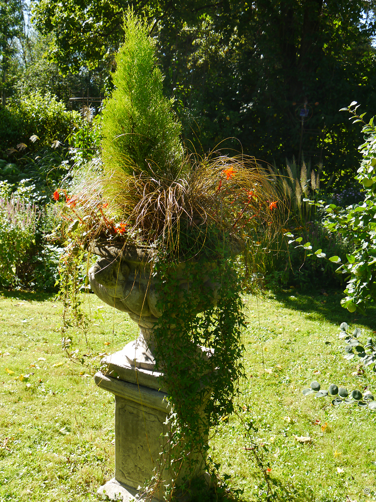 Schattig trockene Problemstellen kennt Inge nicht. Wenn ich mir die Leichtigkeit des Schattenbeetes mit Pfauenradfarn, Adiantum pedatum, Pfennigkraut, Lysimachia nummularia und dem Frauenmantel, Alchemilla mollis, anschaue, dann kann ich nur sagen, Hut ab. Wo gar nichts wächst, da steht eine kleine Skulptur und… irgendein passendes Gras findet Inge immer. Auch im “Weißen Garten” gibt es Schattenpartien. Arum italicum, der Aronstab, hat zwar weiß geblüht, aber jetzt leuchtet er weithin mit seinem roten Beerenschmuck. Damit das Rot nicht völlig ausbüxt, stehen die Blätter einer weiß panaschierten Brunnera dahinter. Ich finde die Kombination sehr attraktiv.