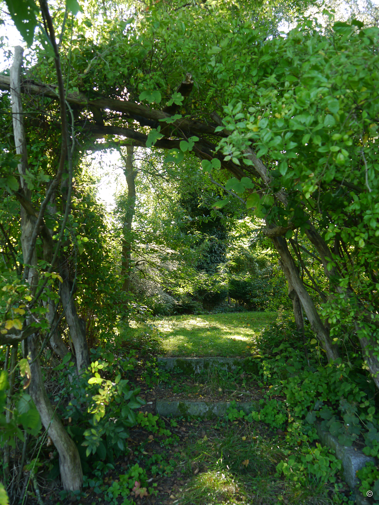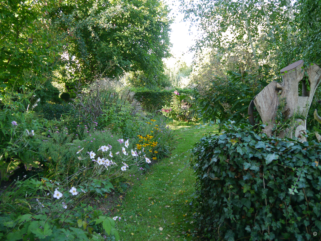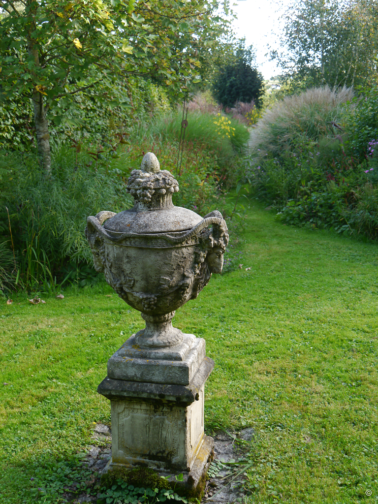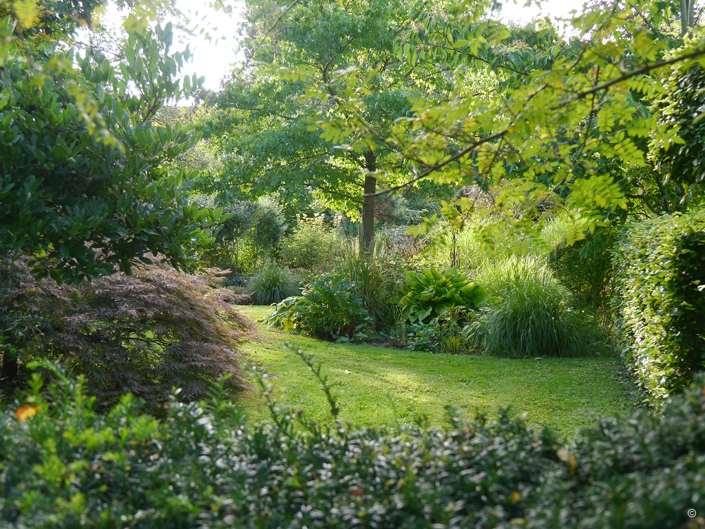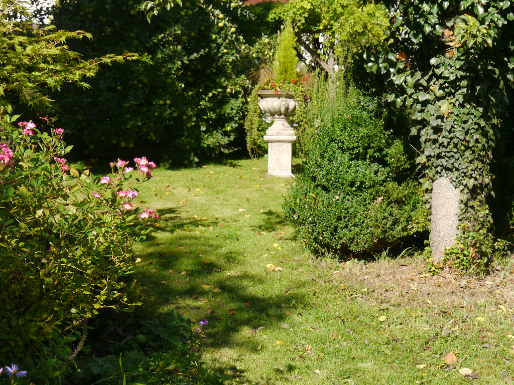 Ich gehe zurück zu den wenigen Stufen, um mir in Ruhe den letzten Gartenteil, den langen hinteren Garten, anzusehen. Wie fast überall leitet mich auch hier ein Rasenweg und wird auch hier der Blick die Sichtachsen entlang, immer wieder nach einer Weile mit geschickt platzierten Pflanzinseln, Gehölzen oder seltener mit geschmackvollen Gartendekorationen unterbrochen.
