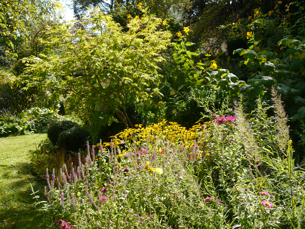 Inzwischen ist der Garten von Inge gereift und ein harmonisches Ganzes geworden. Die Gehölze zeigen ihren typischen Habitus und die Stauden sind gut eingewachsen. Die Hosta ‘Sum and Substance’ benötigt fast einen Quadratmeter Platz zum Ausbreiten ihrer goldgelben Rosette. Andere Pflanzen dürfen einfach ineinander hineinwachsen.