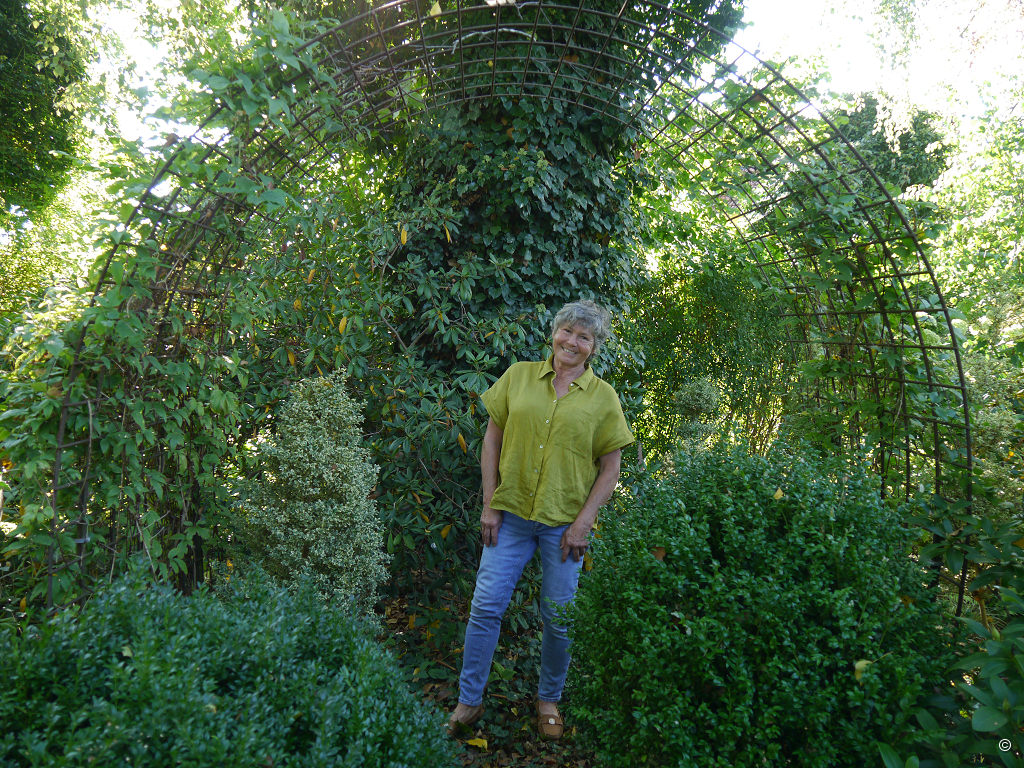 Ganz anders ist es rund um die Peripherie, die viele unterschiedliche Facetten zeigt, aber hauptsächlich unter dem Aspekt “so natürlich wie möglich” angelegt ist. Der Platz vor dem Baumbestand, der den vorbeifließenden Bach begleitet, und an dem ich Inge fotografiere, ist für mein Empfinden ein starker, positiver Kraftort. Darum wundere ich mich auch nicht, als Inge erzählt, dass sie hier mit “ihrem” Garten angefangen hat.