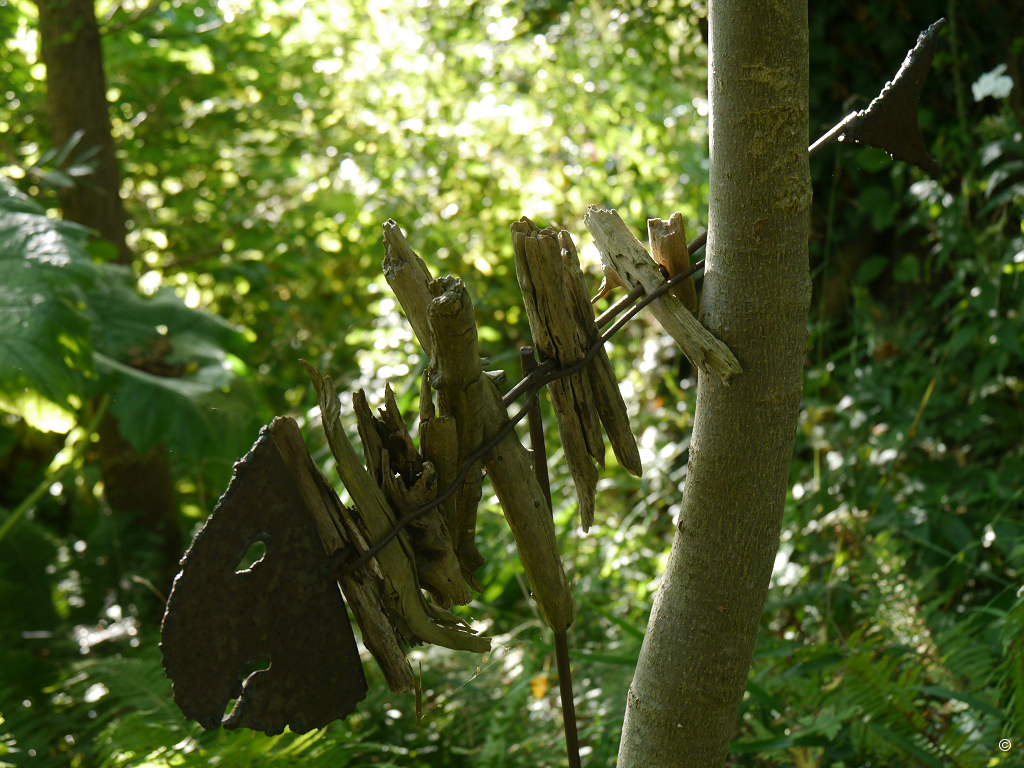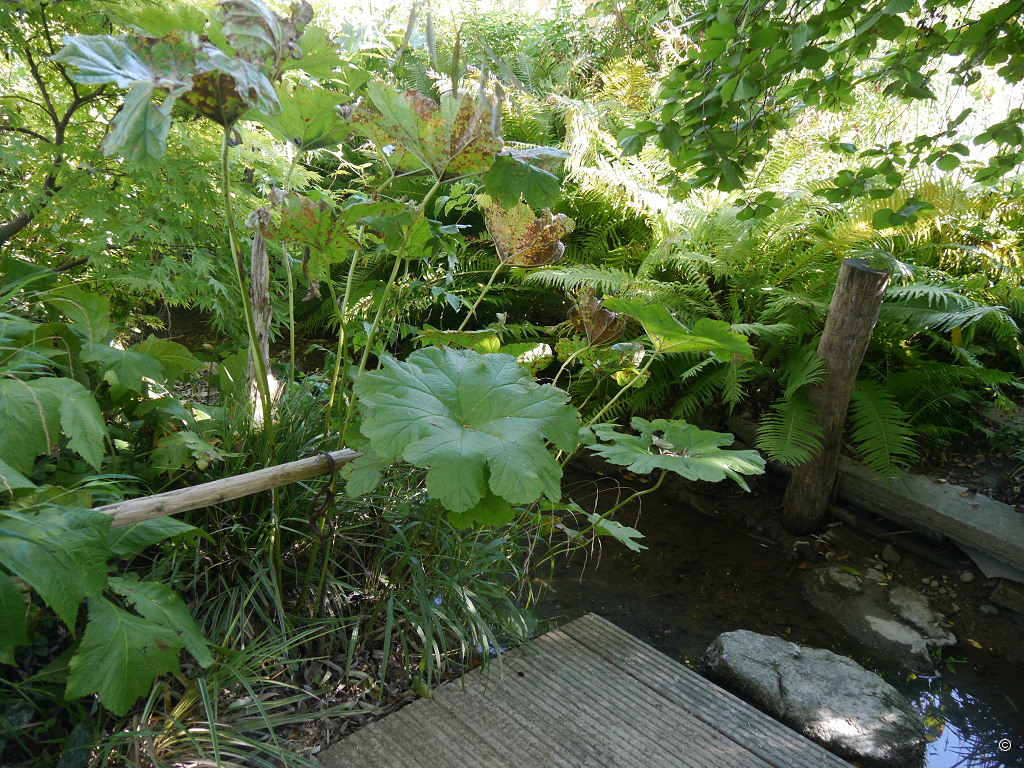 Als die drei Söhne von Inge größer waren, kam endlich die Zeit, mit der Gartengestaltung zu beginnen. Inge stand vor dem Baumbestand am Bach und dachte, das Grundstück passe perfekt für Rhododendren und legte los. Wir sind inzwischen durch den Waldbodenweg bis zum Bach, der Goldach, vorgedrungen. Kein Wunder, dass Inge zum heimeligen Platz des Steges, den ihr Mann gebaut hat, eine nette Geschichte einfällt.
