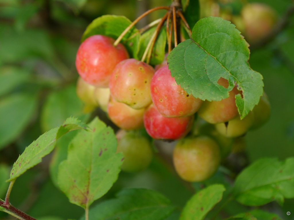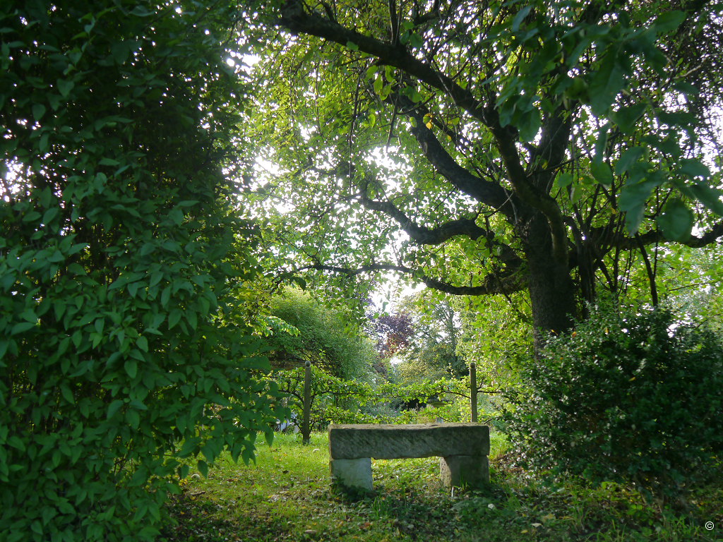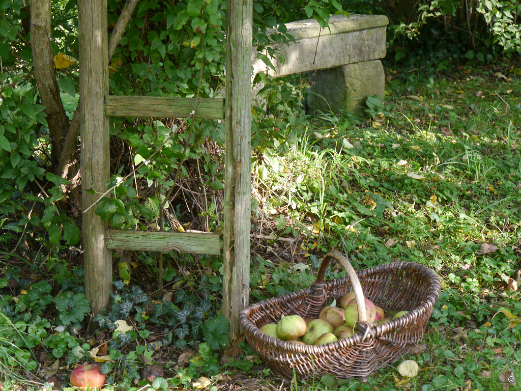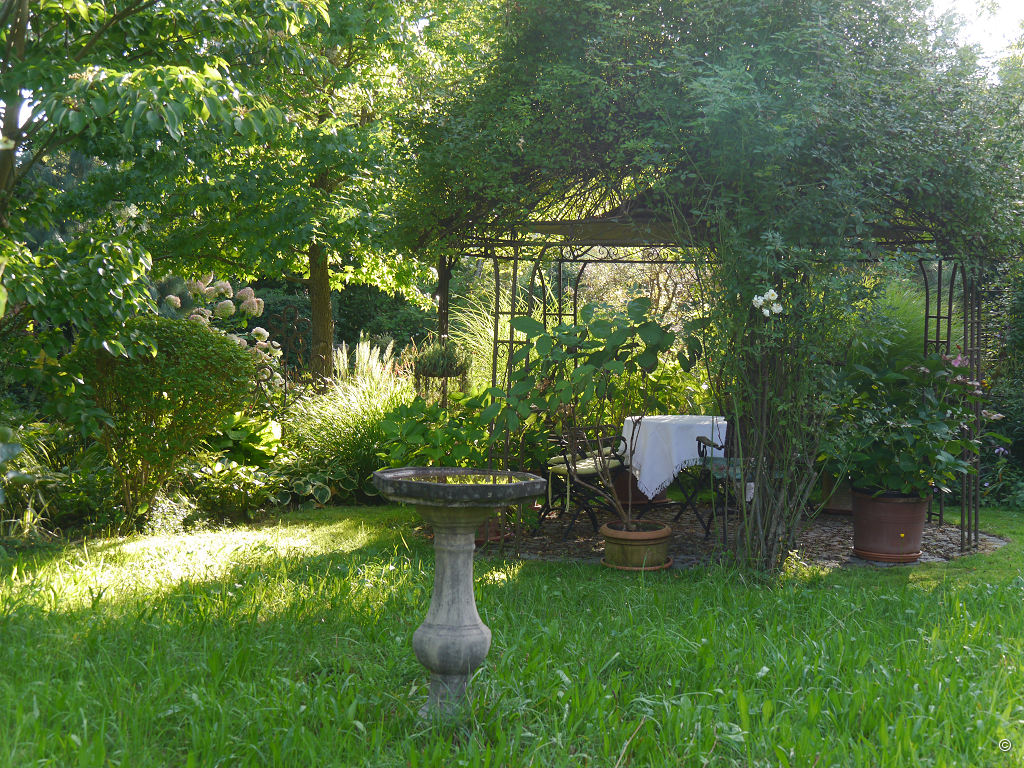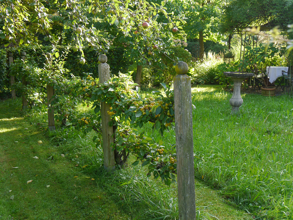 Bevor ich aber dort weitergehe, locken mich ein paar Stufen hinauf in den Apfelgarten und zur steinernen Bank. Beim Vorbeigehen sehe ich die spalierartige Abgrenzung der Zieräpfel Malus ‘Evereste’ und ‘Golden Hornet’. Dahinter steht der Pavillon mit seinem Rosenrambler-Dach. Mitten in der Orchideenwiese vor dem Pavillon befindet sich die steinerne hohe Vogeltränke.