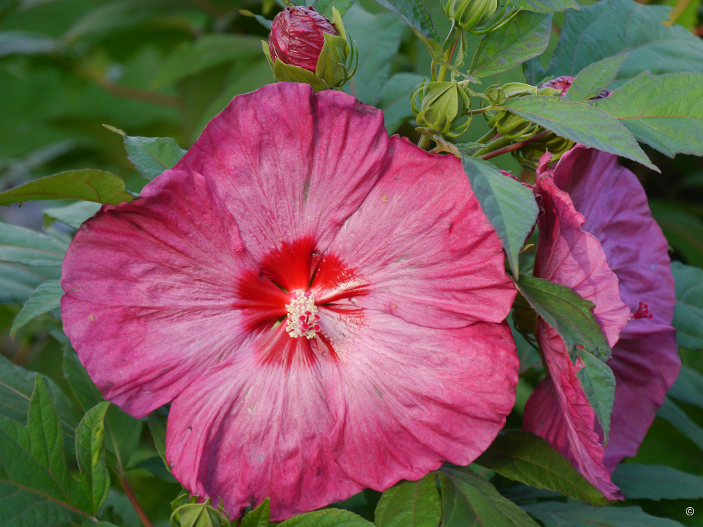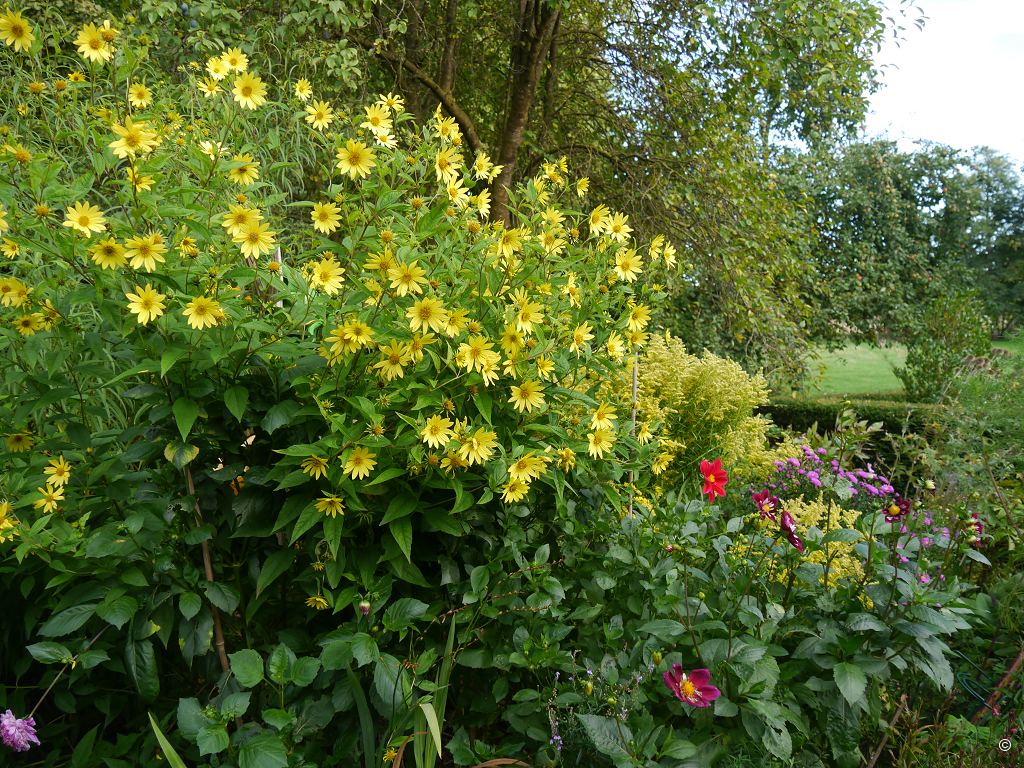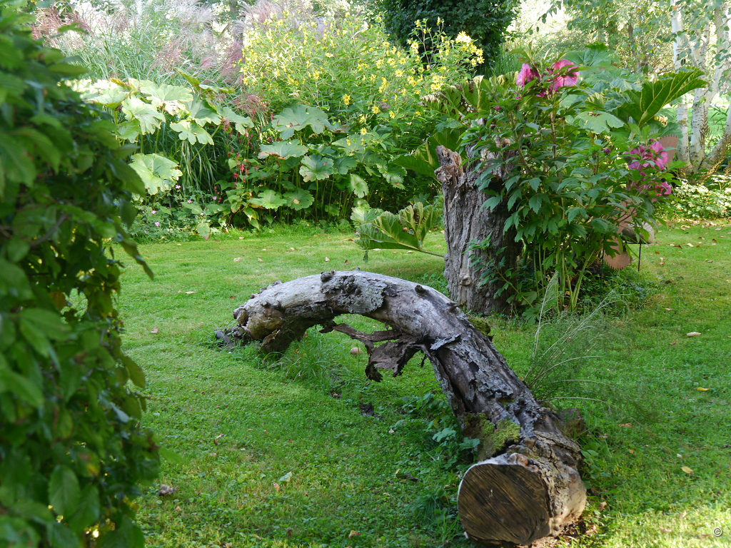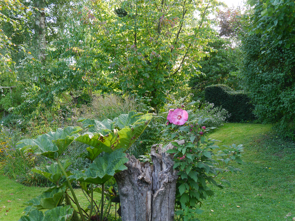 Aber, ich muss doppelt so gut aufpassen, dass ich nichts verpasse, was rechts und links von mir zu sehen ist. Es lohnt sich auf jeden Fall, sich die ausgewogene Mischung aus bewährten Stauden und Gehölzen, durchmischt mit raffinierten Raritäten, genauer anzusehen. Die weißen Blütchen des “Sieben-Söhne- des-Himmels-Strauchs”, Heptacodium miconioides, duftend zu den weit geöffneten Schalenblüten von Anemone hupehensis ‘Ouvertüre’ geneigt, sind sie nicht entzückend? Hibiscus x moscheutos ‘Candy Crash’, eine Sumpfeibisch-Züchtung, hat einen Soloplatz verdient. Um ihn optisch zu erden, hat ihn Inge mit Totholz kombiniert.