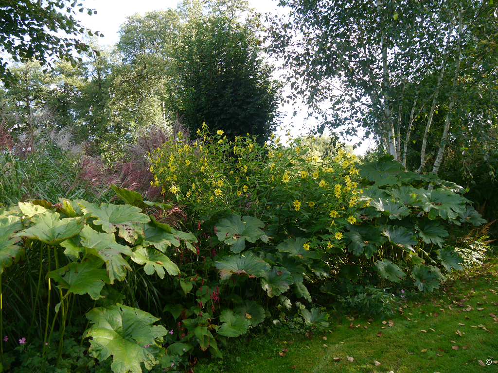 Ein weiterer Umstand, der die Leichtigkeit des Gartens unterstützt, ist Inge Feckls Liebe zu den Gräsern. Ihr filigraner Habitus und die vielen interessanten Grün-Spielarten sind wichtige Elemente bei Inges Pflanzungen. Unter den Gehölzen übernehmen diese Aufgabe gelegentlich Farne, die sie genauso schätzt, wie ihre Gräser. Dem Habitus von Miscanthus ‘Malepartus’ setzt Inge mit der großblättrigen Darmera peltata und einer weiteren Leitstaude, der spätblühenden Helianthus ‘Lemon Queen’, spannende Kontraste in der Wuchsform entgegen.