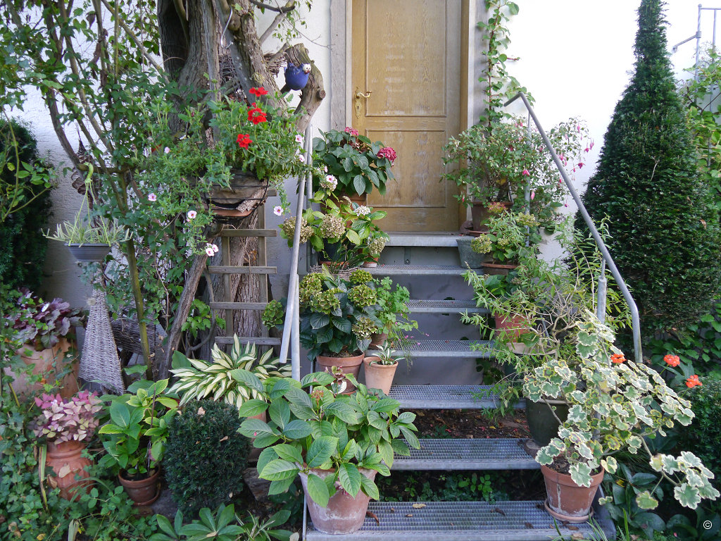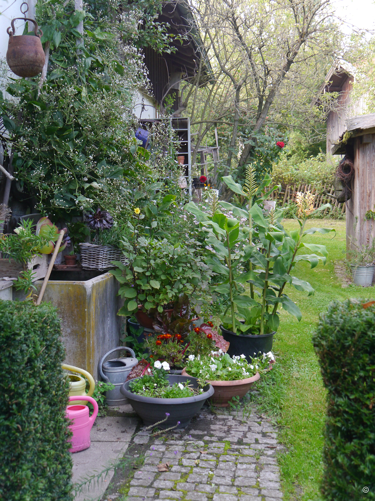 An der Hausecke endet der Rasenweg. Die Hausmauer wird von Kopfsteinpflaster in unterschiedlicher Breite begrenzt. Für besondere Pflanzen, wie die ausgepflanzte Spalierbirne, gibt es Erd-Aussparungen. Die Sitzplätze passen, schön umspielt vom Topfgarten, gut in die terrassenartigen Verbreiterungen des Hausweges hinein. Dutzende Kübel von Hostas, Duft-Pelargonien, Fuchsien, Agapanthen bis hin zu mächtigem Zieringwer stehen die Hauswand entlang Spalier. Im Baum hängen Epiphyten, wie der Farn Polypodium formosanum.