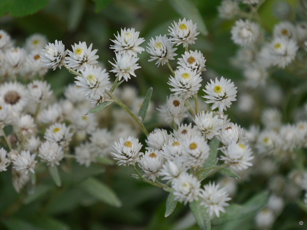 Wie Inge es geschafft hat, ihrem Garten trotz der vielfachen Verwendung von Gehölzen eine Weichheit und Leichtigkeit in diesem Ausmaß zu verleihen, ist mir lange ein Rätsel. Dann finde ich langsam die Erklärung. Im Garten sind Koniferen sehr sparsam eingesetzt. Die langnadelige Tränenkiefer, Pinus wallichiana, die ich im Querteil neben der Hortensie ‘Limelight’, bewundert habe, wirkt weder dunkel noch schwer. Die vielen kleinblättrigen Gehölze sind ebenfalls locker und lichtdurchlässig und belasten die anmutige Wirkung des Gartens nicht. Gehölzlastige Gartenteile bekommen mit immergrünen Rhododendren einen optischen Zusammenhalt, so dass eine gute Ausgewogenheit vorhanden ist.