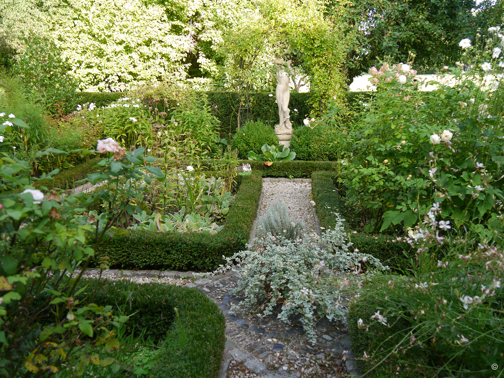 Von der Hausbank genießt man einen schönen Blick über den “Weißen Garten”. Auch wenn der Rambler bei der steinernen Aphrodite um diese Zeit längst verblüht ist, so hat dieser formale Garten mit Wegkreuz doch eine sehr erhabene Ausstrahlung. Remontierende Rosen, Phlox, Prachtkerzen und die Herbstanemone ‘Honorine Jobert’ zeigen sich noch immer in strahlendem Weiß.