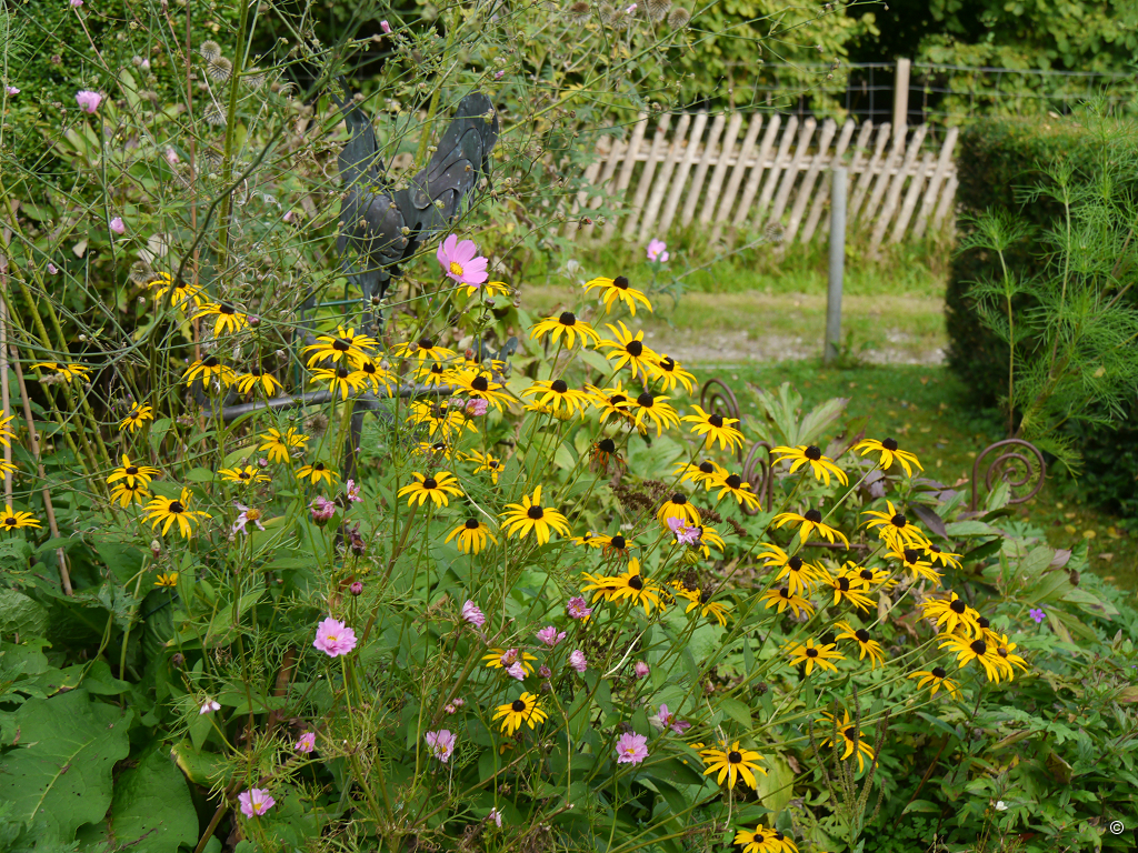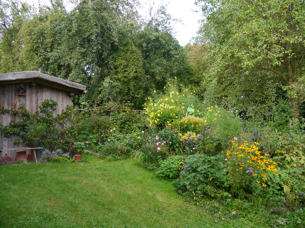 Es ist ein gelungener Schachzug, wie Inge mit ihrem gestalterischen Gespür diesen rückwärtigen Hausteil geplant hat. Die durchgehende Hausbegrünung schafft zusammen mit dem Kopfsteinpflasterweg eine geschlossene Einheit. Der rundum laufende Garten mit seinem Park ähnlich wirkenden Wiesenweg und den unterschiedlichen Sichtachsen, sowie der natürlichen Peripherie wird erst durch eine kleine Querhecke ausgebremst und endet dann endgültig am Gewächshaus. Dahinter schließt sich das weiße, streng formale Gartenquadrat an. Dann folgt der abschließende, lockere Bauerngarten in seiner herbstlichen Buntheit und löst alles in fröhlicher Harmonie wieder auf.