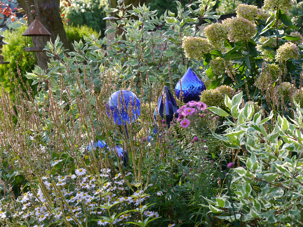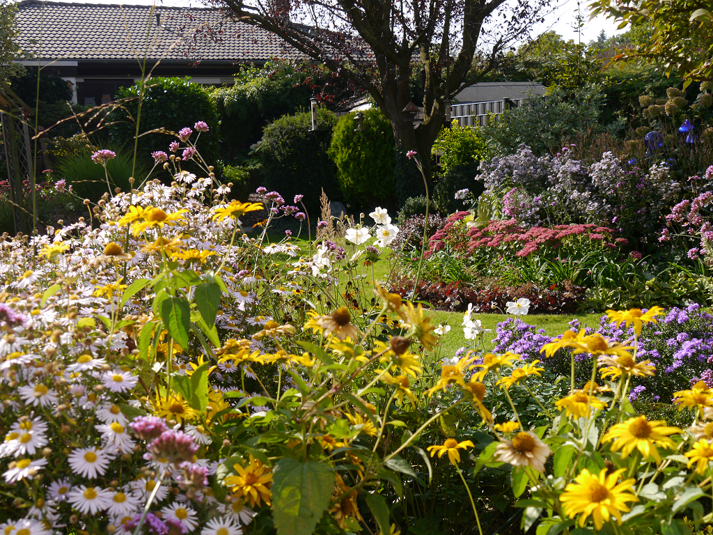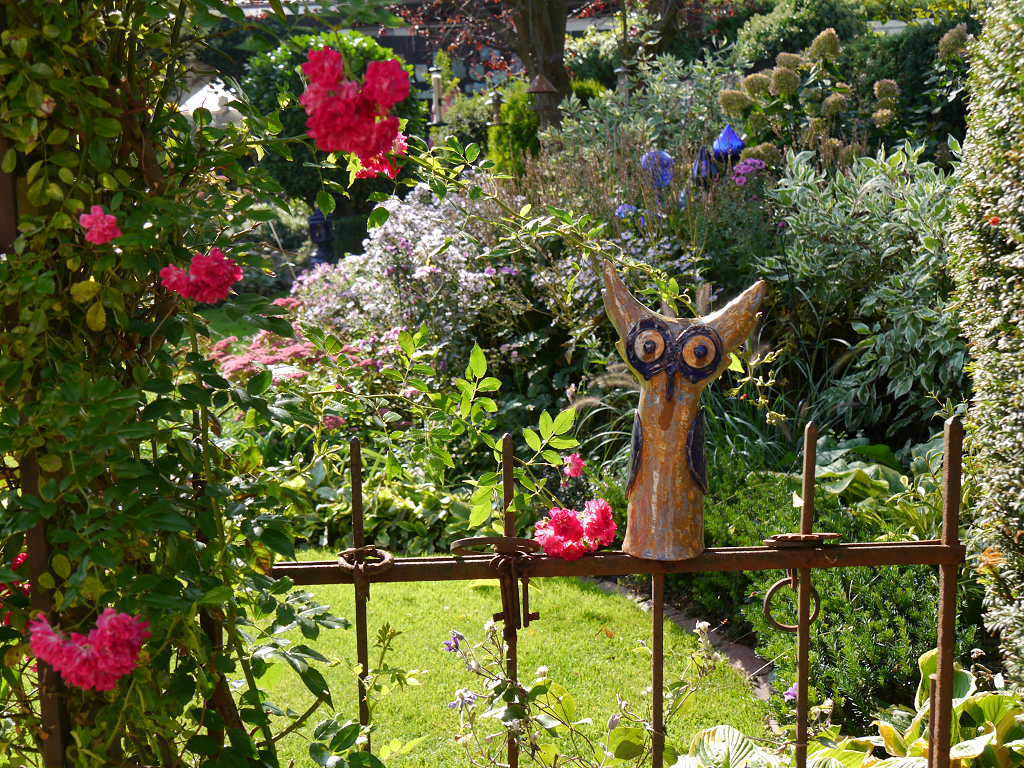 Eigentlich fängt der Spaziergang ja im Vorgarten an, aber das Eingangsbild oben zeigt so wunderbar den Charakter dieses Gartens, dass ich schon mal von der Terrasse aus einen Blick in den hinteren Garten-Teil riskiert habe. Im Eulengarten geht es nicht nur tierisch hoch her, hier wird auch nach Karl Foersters Motto “durchgeblüht”.