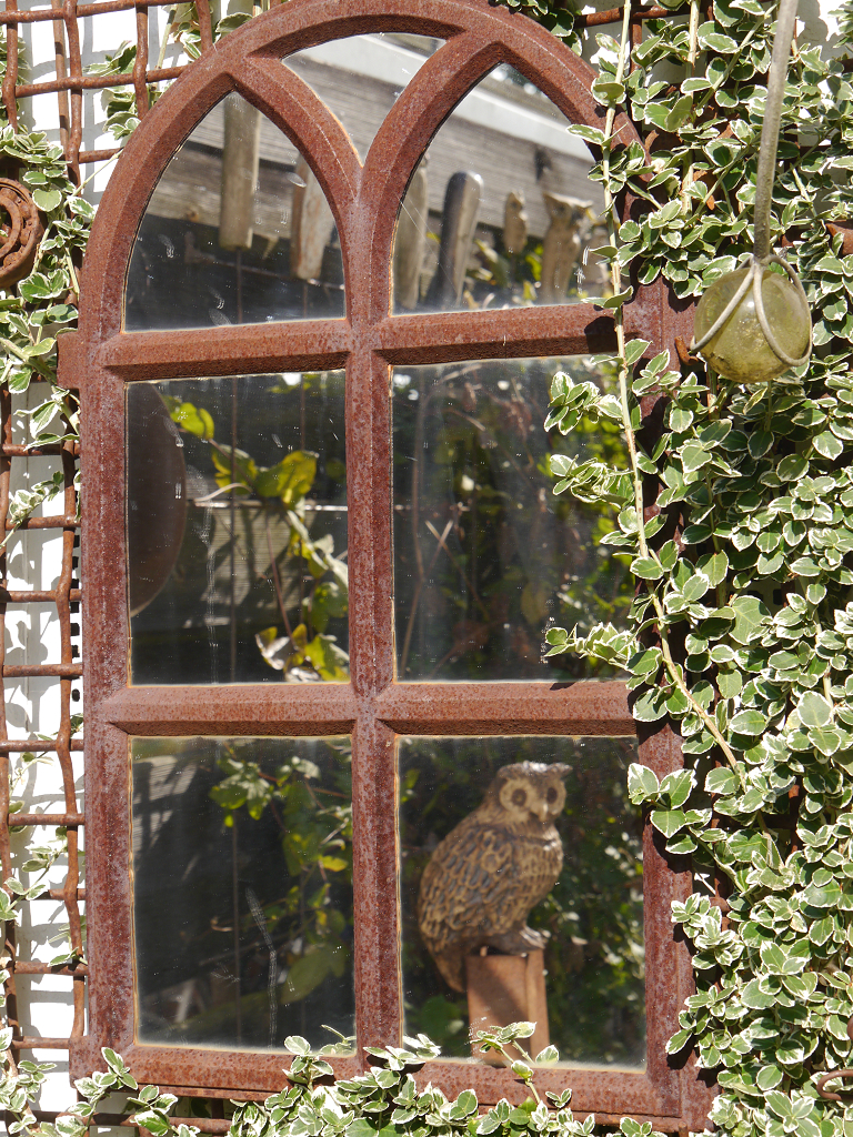 Auf der rechten und linken Seite des Hauses gibt es Einbuchtungen, eine führt zur Garage, die andere zur Grundstücks-Grenze. Mit viel Phantasie hat Martina dafür gesorgt, dass das keineswegs ein toter Winkel ist. Ein Spiegel vergrößert optisch den Raum, hellt auf und vermehrt spiegelbildlich die Eulen. Vielleicht fragt diese auch nur: “Spieglein, Spieglein an der Wand, wer ist die schönste Eule im Land?”