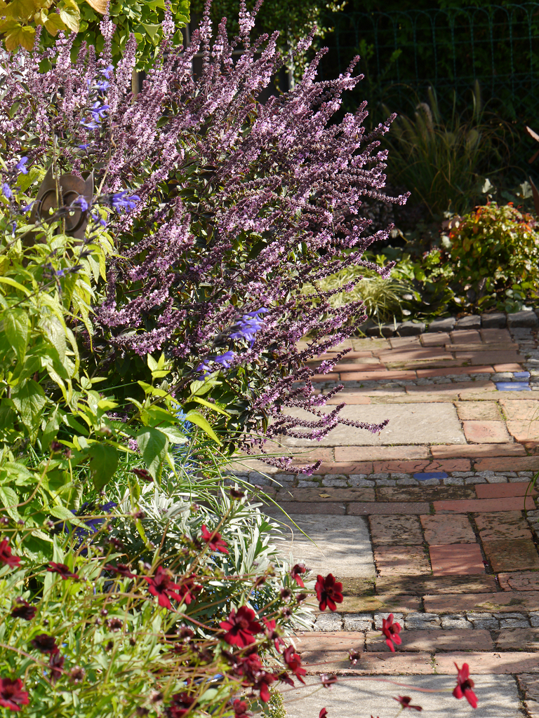 Direkt an der Hauswand finden sich Schokoladenblumen, Salvia ‘Amistad’ und das Basilicum ‘African Blue’. Letzteres ein “absolutes Muss” in jedem Sommer für Martina Krauses kleine geflügelte Gäste.