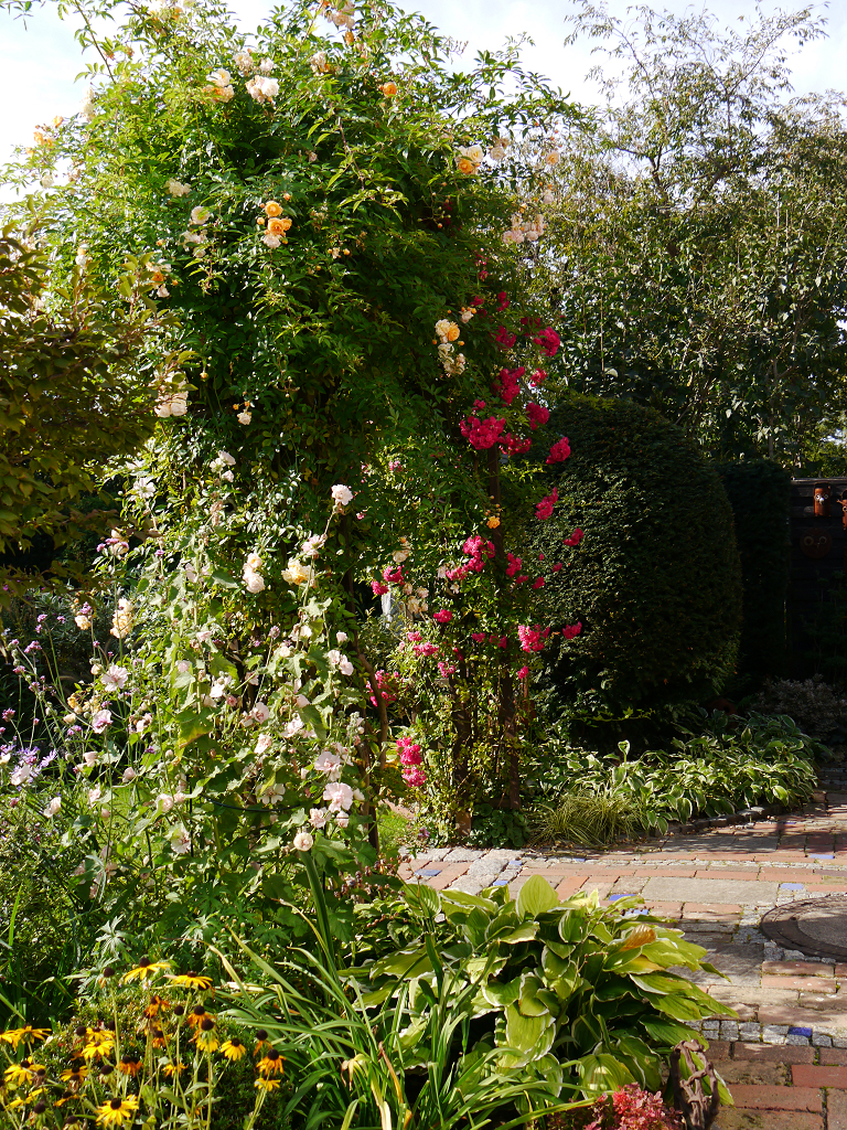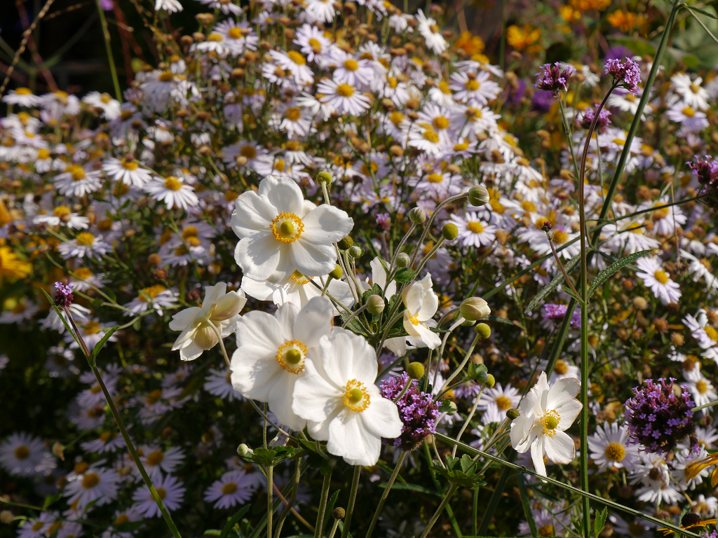 Ich wende mich jetzt aber dem durchgehenden großen Terrassen-Beet zu und will einfach nur in diesem herrlichen Blütenmeer schwelgen, das man sowohl vom Haus als auch von den beiden Sitzmöglichkeiten im Garten gut überblicken kann. Ich sah den Garten schon im Sommer 2019 in voller Blüte, mit herrlichen Stauden und Rosen und war einfach platt, als ich Anfang Oktober 2020 feststellte, dass die Blüh-Freudigkeit des Gartens im Herbst keineswegs nachlässt. Die schwächer werdenden Rosen hielten sich farblich an Herbstanemonen und Sedum zur Verstärkung und was die Katzenminze im Sommer geschafft hat, das erreichen die Astern und Kalimeris doch allemal im Herbst. Die Anemone ‘Honorine Jobert’ lässt sich von Verbena bonariensis umspielen. Am Rosenbogen gibt Rosa ‘Super Excelsa’ noch einmal alles und an der Garagenseite des Gartens wird das Beet auf der Höhe des Haus-Endes durch eine Sichtschutz-Wand quer abgetrennt, um dahinter Platz für die Hochbeete und die Pflanzen-Kinderstube zu gewinnen. Auch am Sichtschutz klettern verschiedene Rosen empor.