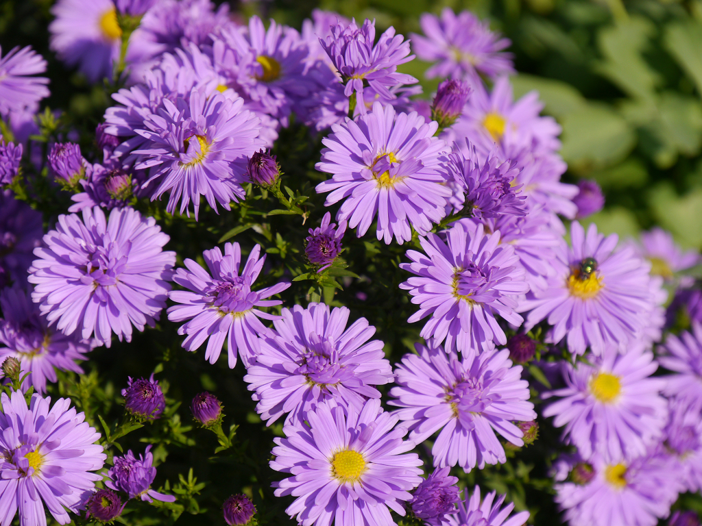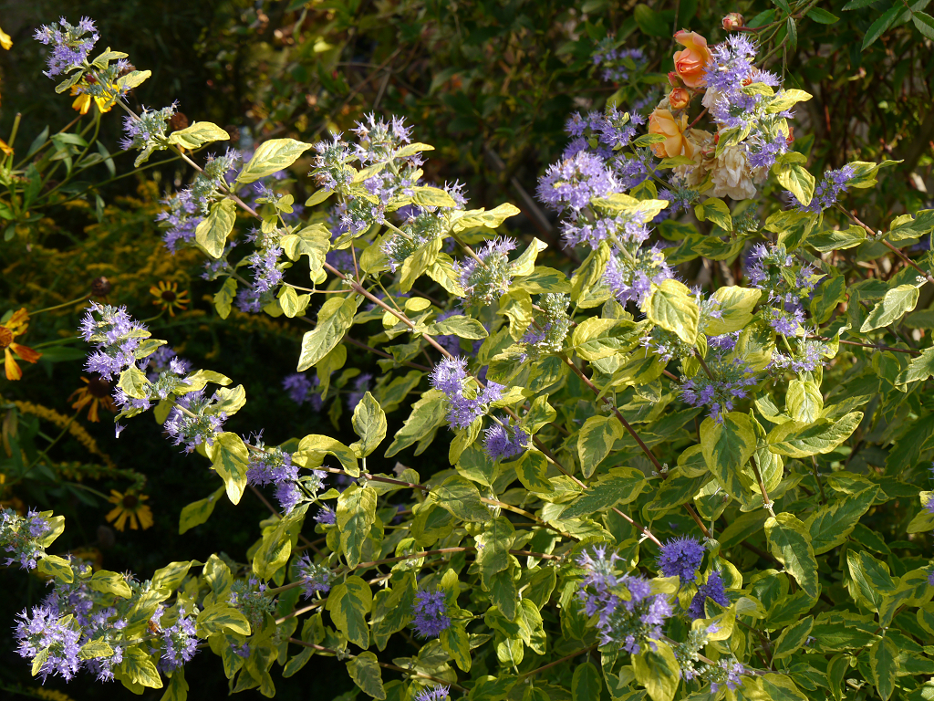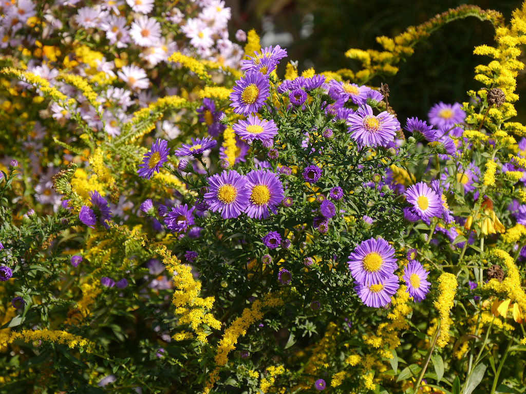 Wo starke Rosenfarben das Bild bestimmen, wie hier die ‘Ghislaine de Feligonde’ unterstützt von der Goldrute, Solidago, da kann blau eine schöne Verbindung zu anderen Farbvarianten sein. Weiß ist nicht immer ein “muss”, wie man an der Glattblattaster ‘Schöne von Dietlikon’, oder der Bartblume, Caryopteris clandonensis ‘Summer Sorbet’ sieht.
