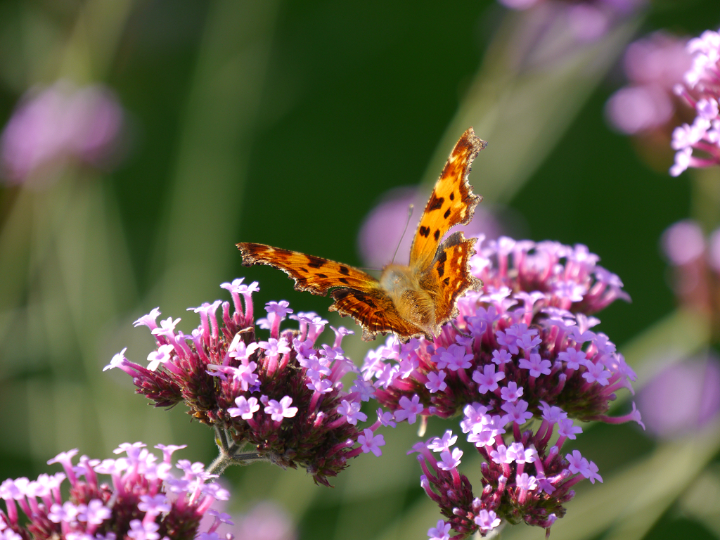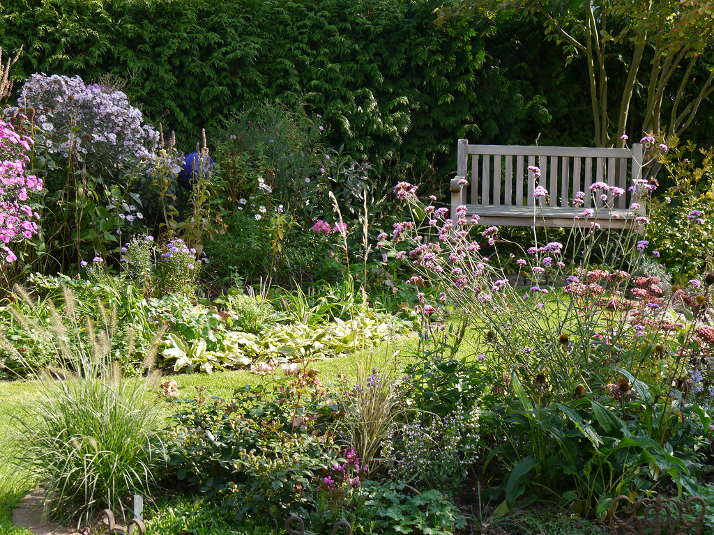 Es gibt soviel zu sehen von diesem Platz aus, der ja nicht direkt am Haus, sondern im Garten platziert ist. Egal ob man Schmetterlinge wie den Admiral oder C-Falter beobachten möchte, oder einfach über die lebhaften Mixed Border schauen will, das Auge kommt gar nicht zur Ruhe, so viel gibt es schon alleine im Sitzen zu entdecken.