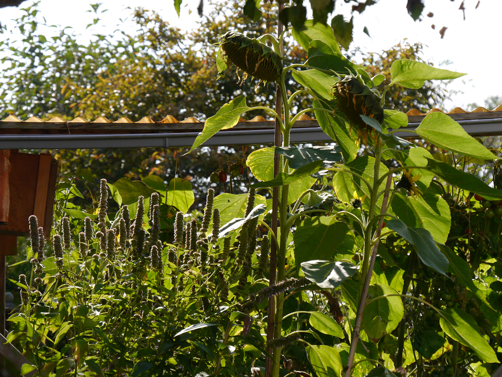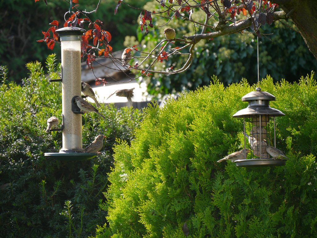 Pflanzenporträts und die Vogelfutterstelle, wo sich eine kleine Horde Spatzen verlustiert, alles bietet sich bequem im Sitzen zum Schauen an.