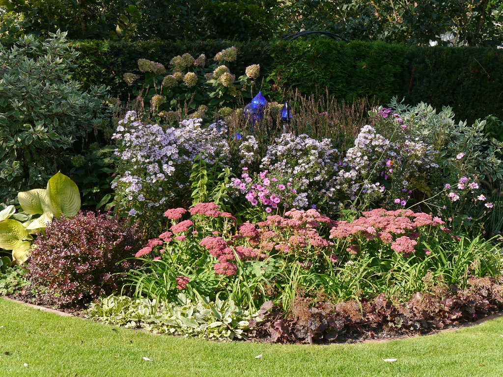 Nicht nur das Sedum ‘Herbstfreude’ vor den Astern begeistert. Die pflanzliche Vielfalt auf kleinem Raum, die neben der Kissenaster ‘Rubin’, Euphorbia ‘Tasmanian Tiger’, Stachys ‘Big Ears’ und Lamium zeigt, somit enorm ist, lässt sich von der Bank aus wieder gemütlich überschauen.