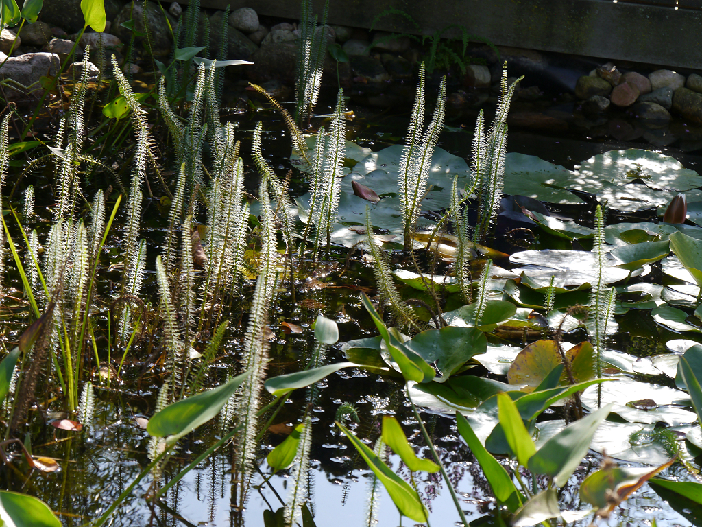 Es gibt auf der Bank nur ein Problem, die sonnenbeschienene Wasser-Oberfläche des Teichs lächelt mich mit den Tannenwedeln (Hippuris vulgaris), dem Hechtkraut (Pontaderia cordata) und den Seerosenblättern (Nymphea) so schelmisch an, dass mich nichts am Platz hält.