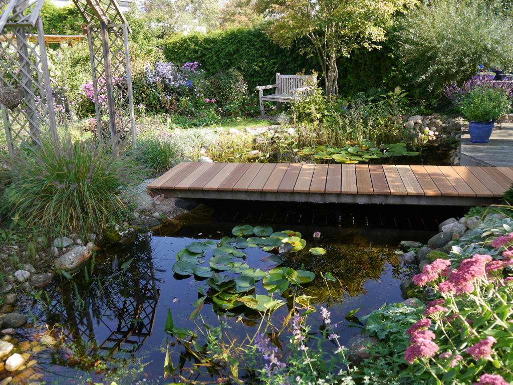 Der Teich ist groß, über einen Steg erreicht man ein großzügiges Holzdeck auf dem sich der zweite Sitzplatz des Gartens befindet. Wiederholungen sind nicht nur bei Pflanzen in einem Garten eine gute Wahl, das erkenne ich unschwer an den gleichen Gartenmöbeln und Sitzkissen, wie ich sie schon auf der vorderen Terrasse vorgefunden habe.