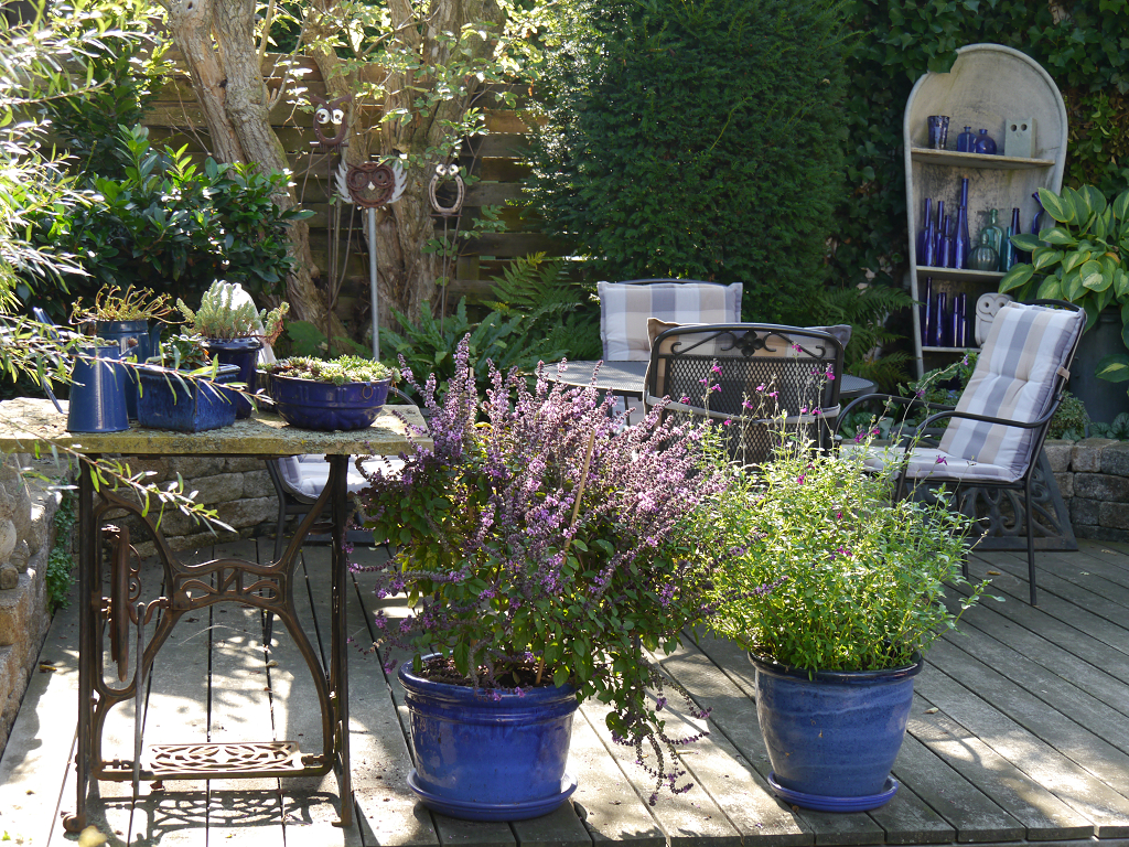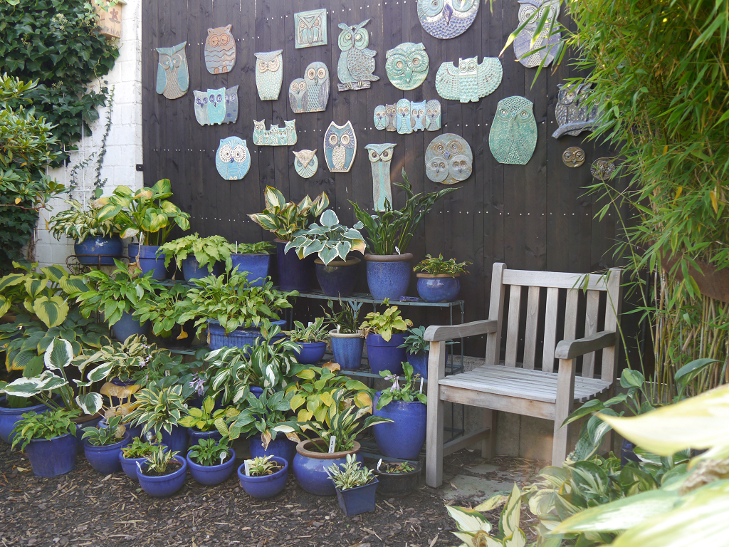 Dazu gibt es zwei wichtige Gestaltungsmerkmale, die sich durch den kompletten Garten ziehen. Die Dekorationen sind Eulen und bleiben Eulen, so kann es nie zuviel werden. Dann gibt es noch einen “roten Faden”, pardon, einen blauen Faden – die offensichtliche Lieblingsfarbe Martinas. Sie findet sich überall; dezent eingesprenkelt im Pflaster, in Übertöpfen und natürlich auch bei den Eulen und Blumen im Garten. Soviel erst einmal allgemein zu diesem städtischen Kleinod.