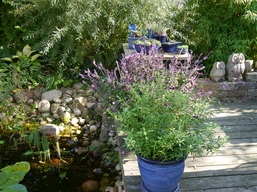 Langsam gehe ich weiter nach hinten, der zweite Sitzplatz auf dem großzügigen Holzdeck hinter dem Teich ist schon hinter den Stauden zu erkennen.