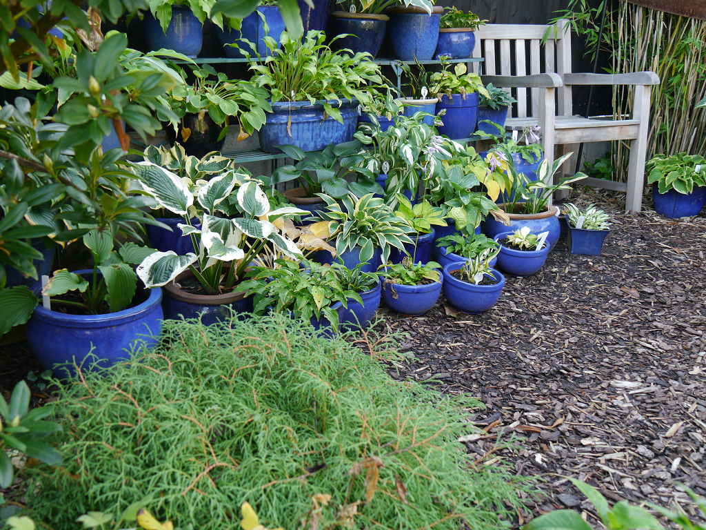 Rechts hinten in der Ecke finde ich dann “De Hosta Tuin”, einen Großteil der nicht ausgepflanzten Exemplare alle liebevoll in blaue Übertöpfe gesetzt und von den kreativen schönen Eulen an der Wand beäugt. Die kleinen “Hosta-Mäuse” haben übrigens ihren Logenplatz direkt auf dem Abschluss-Sims des Holzdecks.