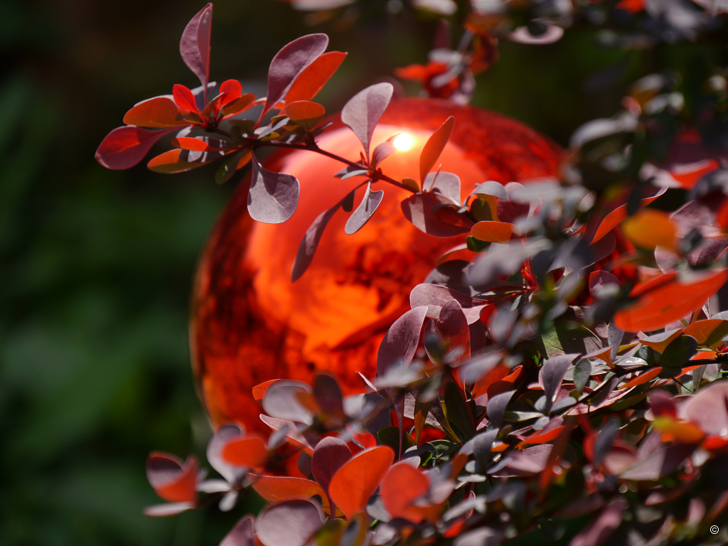 Während die weißen Blüten einer Choisya, Orangenblume, die Farbe der Narzissen aufnimmt, sehe ich am Zaun eine Blutberberitze. Schon fast theatralisch wirkt die rote Rosenkugel davor. Ich fotografiere unmittelbar in die Kugel hinein und stelle mir vor, wie dieser Glutball von Sonne abends im Meer versinkt. Nicht nur mich begeistern Gestaltung und Farbgebung des vorderen Gartens. Oft bleiben Spaziergänger stehen, betrachten die Blütenpracht der Stauden und bewundern die ausgefallenen Gehölze, wie die Choisya, die gerade überschwänglich in Weiß gehüllt ist und ihren Orangenduft über den Zaun sendet. Ist Martina im Vorgarten präsent, entwickelt sich dann auch schnell ein interessanter Austausch mit den interessierten Spaziergängern.