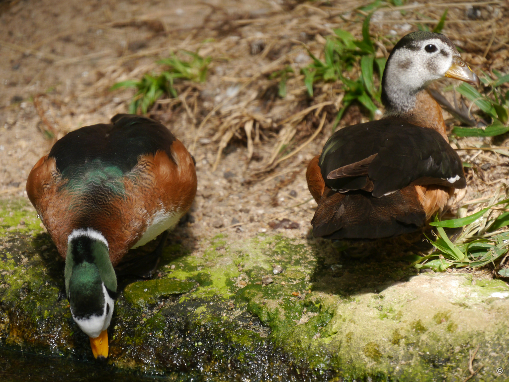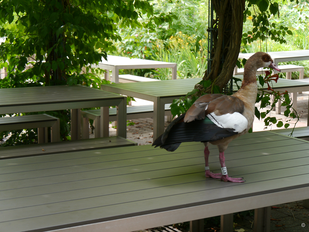 Im Zentrum der aneinandergereihten Glashäuser steht das Palmenhaus. Das Becken, in dessen klarem Wasser Kois leben, der als Bodendecker gepflanzte Moosfarn, bunte Caladium-Tupfer, die wie übergroße Konfetti aus dem grünen Teppich herausragen, dazu hohe Palmen, lassen eine besonders edle, großzügige Wirkung entstehen. Neben dem Palmenhaus, auch Wintergarten genannt, befindet sich ein Glashaus für Kleinsäuger und Vögel. Die Enten, die ich entdecke, entpuppen sich als Afrikanische Zwergglanzgänse, Nettapus auritus, das überrascht mich, sie wären auch als Enten nicht wirklich groß gewesen. Auf der Schmalseite befinden sich zwei riesige Schaufenster, hinter denen sich Insektivoren-Habitate ausbreiten. Besonders beeindruckt mich hier allerdings keine Pflanze, sondern der quirlige “Roadrunner”, ein Wegekuckuck, Geococcyx californianus. Er betrachtet mich eine Weile interessiert, dann macht er sich wieder auf die Suche nach… oh weh, ich hoffe doch nicht, auf eine Klapperschlange?