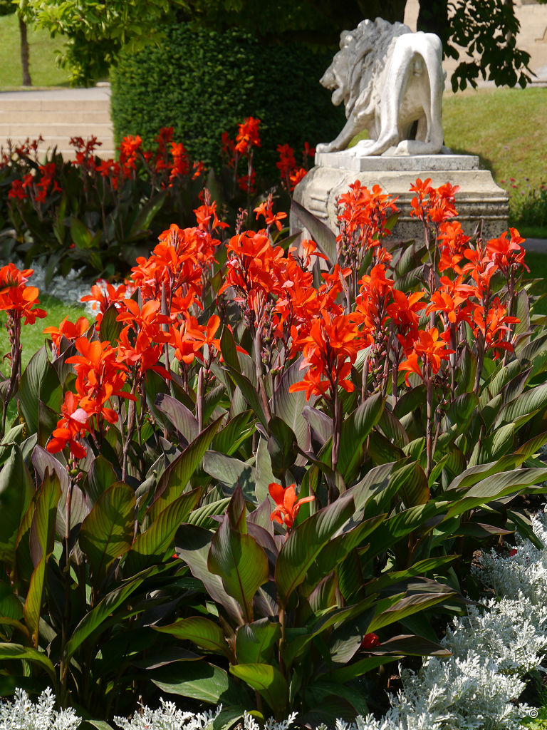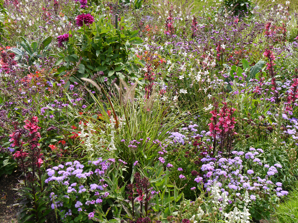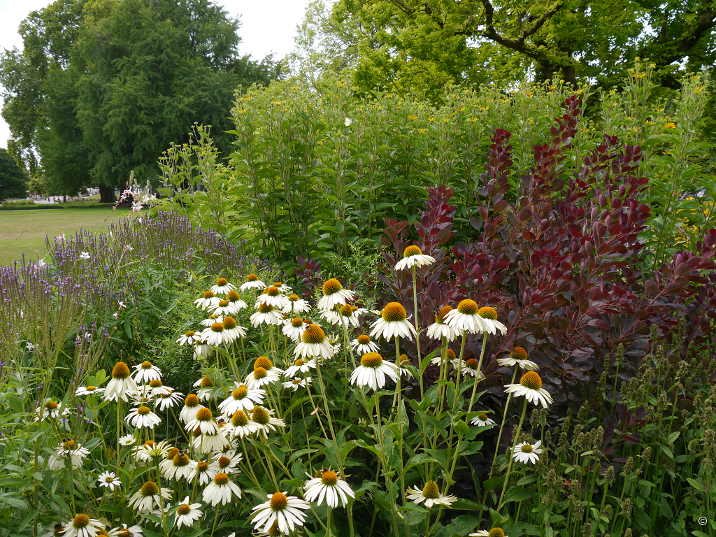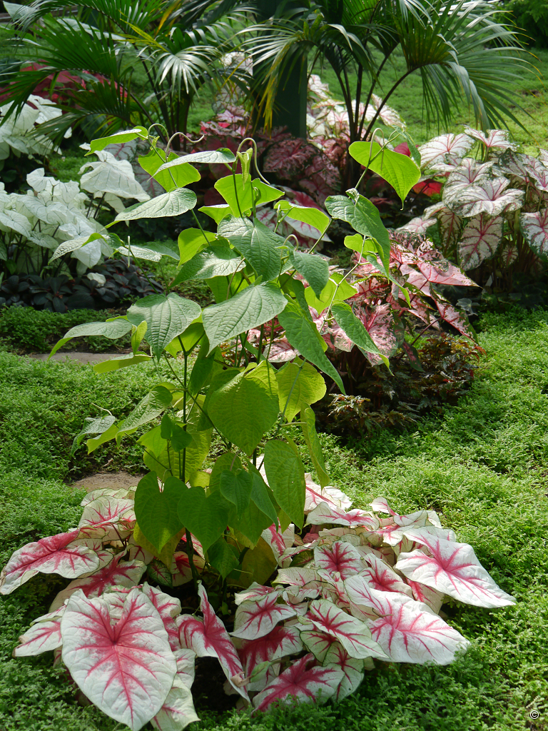 Inzwischen bummeln wir durch das Freigelände und betrachten die Beete mit Einjährigen (Annuellen), Staudenbeete und Mixed Border, die in den großzügigen Rasenflächen angelegt wurden. Das prägendste Element des Freigeländes ist auf jeden Fall der fantastische, wertvolle, alte Baumbestand. Ich möchte gerne wissen, wie die Themenhäuser, z.B. das Amazonienhaus pflanzenmäßig bestückt sind.