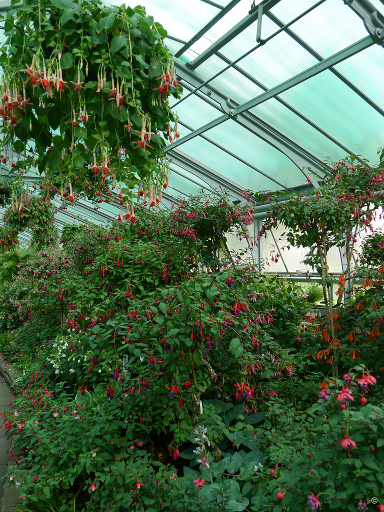 Als wir dieses letzte Glashaus betreten, ist es bestückt mit 260 Fuchsien-Hybriden (als Sträucher, Hochstamm, oder Hängeampel-Pflanzen gezogen) und 50 Wildarten. Da können schnell bis zu 100.000 Einzelblüten den Besucher bezaubern. Damit die Weißen Fliegen ihre Zuneigung nicht zu sehr kund tun, werden hier Schlupfwespen eingesetzt. Es fiel mir schon in den anderen Gewächshäusern auf, dass in der Wilhelma auf Nützlinge, anstatt Gift gesetzt wird.