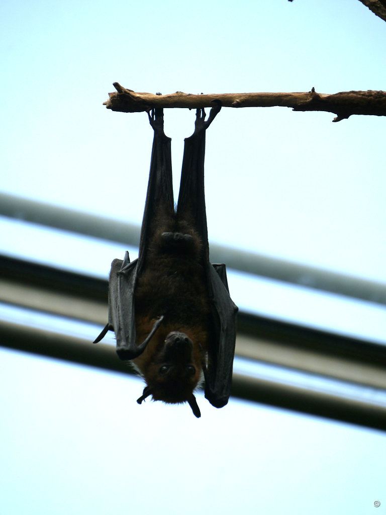Auch die Flughunde, genauer gesagt Kalongs, Pteropus vampyrus, sind im Schmetterlingshaus untergebracht. Das macht Sinn, denn sie lieben es wie die Falter an den Früchten, Pollen und dem Nektar von exotischen Pflanzen zu naschen. Streicheltiere sind es jedoch nicht, es wird davor gewarnt, ihnen zu nahe zu kommen. Es ist Mittagszeit, trotzdem herrscht ein reger Flugverkehr bei den Faltern. Der Flughund lässt sich da eher hängen.