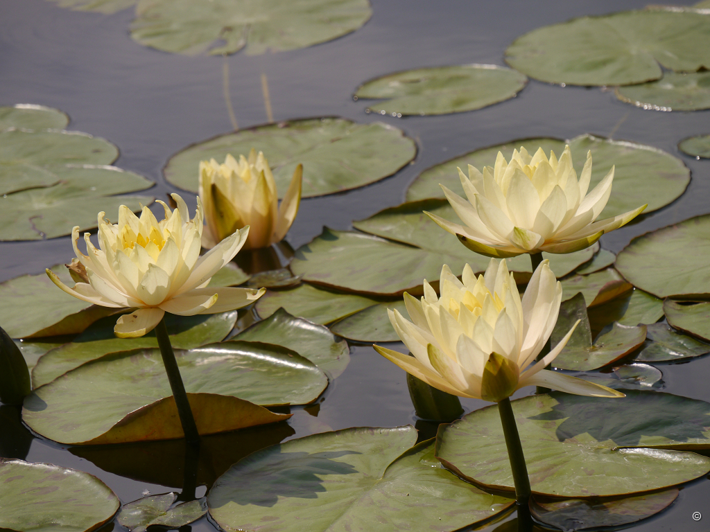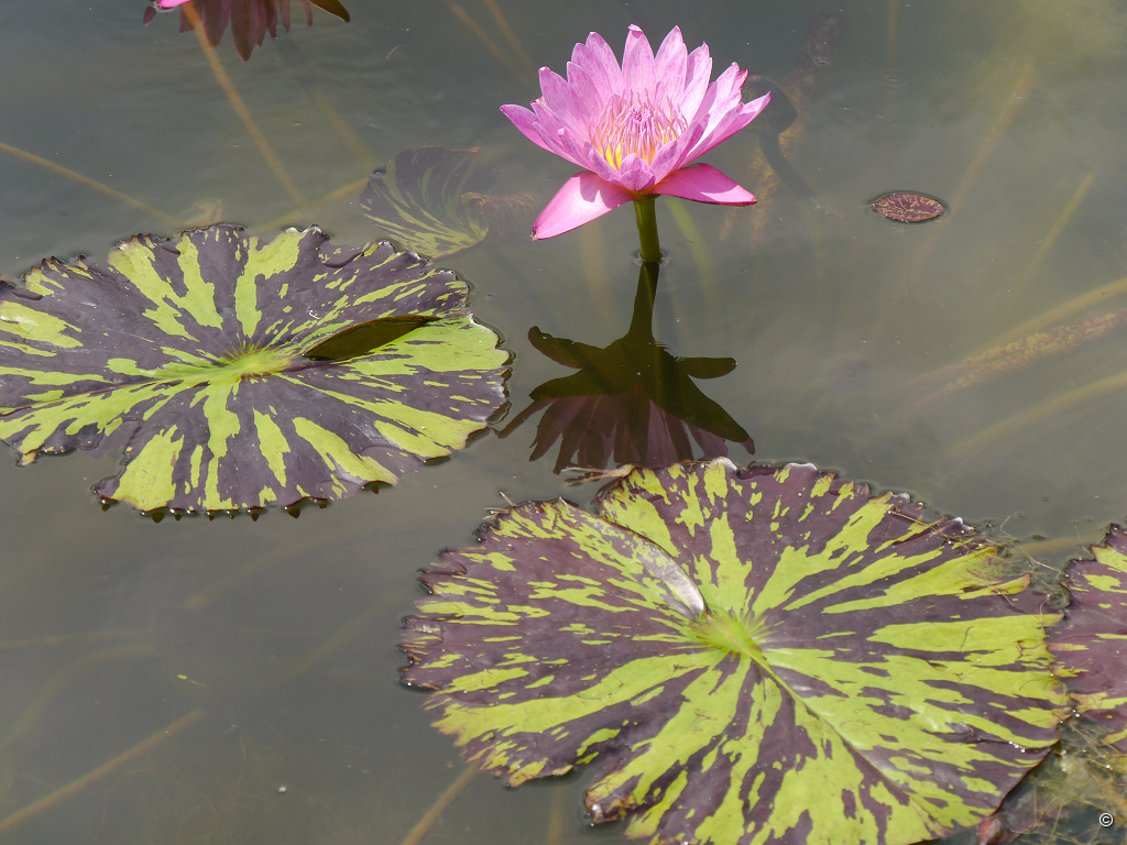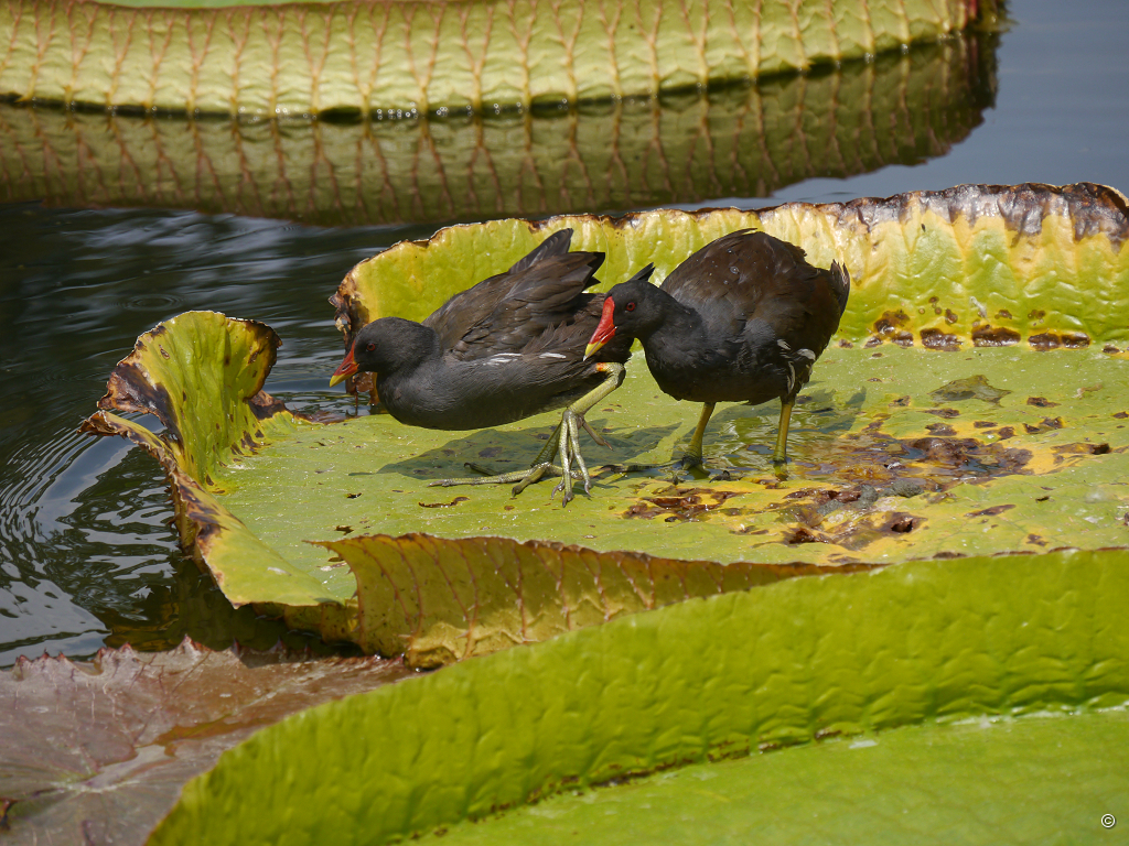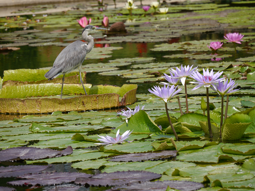 Neben den prachtvollen Seerosen fallen auch die wagenradgroßen Blatt-Tabletts von Victoria amazonica ins Auge. Für den Fischreiher und die Teichhühner sind die Blätter der Riesenseerose das Gleiche, was für uns jetzt Eine der das Becken umgebenden Parkbänke ist. Wir genießen die Trinkpause und schauen und lassen das Ambiente und die Atmosphäre auf uns wirken. Das ist wie ein Wellness-Kurzurlaub. Wir können uns kaum losreißen, steigen aber letztlich die Stufen nach oben, um zum Belvedere und Maurischen Landhaus zu gelangen.