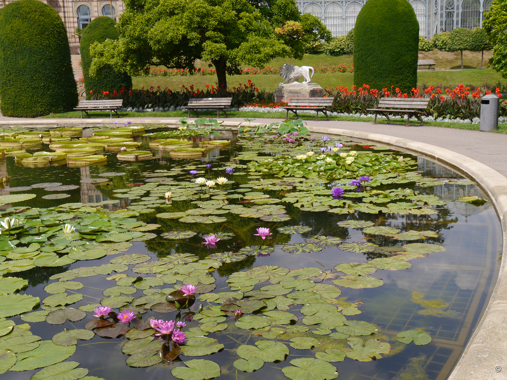 Jeannette und Roberto streben durch die Hauptachse des Maurischen Gartens, am runden Fontänen-Becken vorbei, zum großen Wasserrund in der Mitte, das auf der anderen Seite mit einem weiteren Fontänen-Becken einen harmonischen Dreiklang bildet. Die farbenprächtigen exotischen Seerosen des großen Rundbeckens sind weit zu erkennen und locken auch mich in die Mitte des Maurischen Gartens.