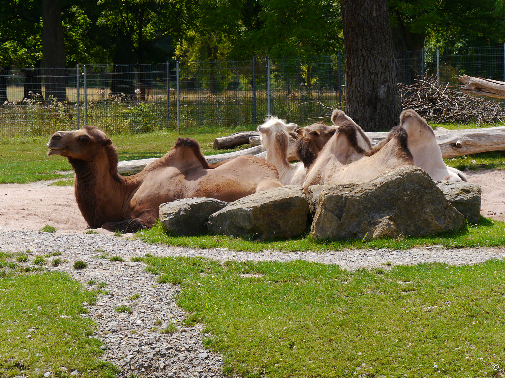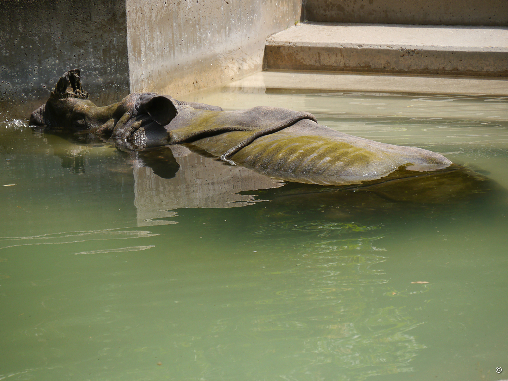 Während die Ziegen das tun, was sie immer am liebsten machen, nämlich fressen und die Trampeltiere, auch wenn sie nicht im eigentlichen Sinne zu den Wiederkäuern gehören, das offensichtlich notwendigerweise tun, irritiert mich das Nilpferd. Warum? Ganz einfach, es ist kein Nilpferd, sondern ein Rhinozeros, das die Mittagszeit im erfrischenden “Pool” verbringt. Wasser? Ach richtig, wir wollten noch in das Aquarium!