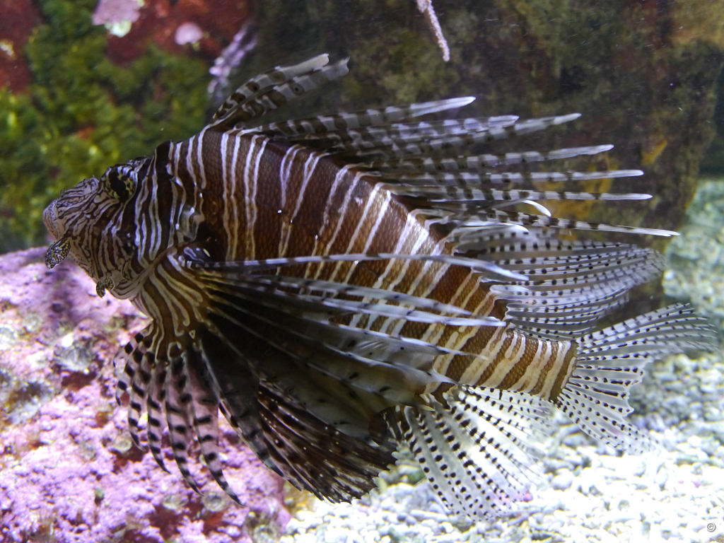 Das Aquarium befindet sich vor dem Maurischen Garten, wir hatten es anfangs links liegen gelassen. Jetzt sind wir im ersten von drei zusammenhängenden Bauten und sehen Aquarien zum Thema Süß- und Salzwasser der Tropen. Die Fische, Korallen und Wirbellosen hier sind farbenprächtig und von exotischem Aussehen geprägt. Es folgt mittig die sechseckige Krokodilhalle, zu der auch die Terrarien gehören. An diese schließt sich der dritte Bau an, in dem die Themen Mittelmeer und heimisches Salz- und Süßwasser zu bestaunen sind. Letzterer ist nicht ganz so spektakulär, darum würde ich das nächste Mal mit dieser Halle beginnen und mir die Pracht der Tropen bis zum Schluss aufheben. Zu sehen sind auf 4300 qm Nutzfläche etwa 4500 Fische in 530 Arten, 1100 Wirbellose in 140 Arten, 305 Reptilien in 90 Arten und 300 Amphibien in 25 Arten. Sie sind in 71 Aquarien, 32 Terrarien, der Krokodilhalle, 5 Freilandterrarien, der Schildkrötenfreianlage, 5 Uferbecken und 6 unterschiedlichen Klimalandschaften untergebracht. Es wird ein Wasservolumen von 500.000 Litern benötigt. Für die Meeresbewohner der Aquarien werden zur Wasseraufbereitung pro Jahr 55 Tonnen Salz benötigt.