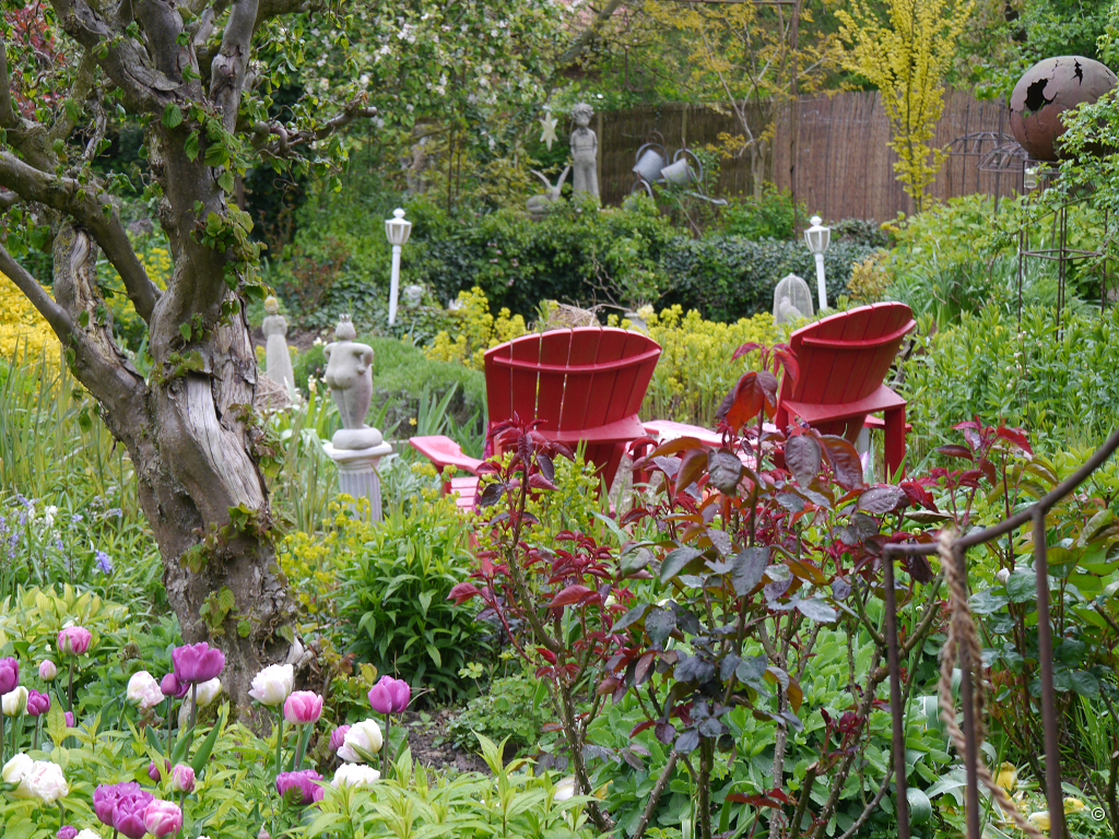 Dann komme ich im großen Garten an, der in unterschiedliche Partien aufgeteilt ist und dank weniger Raumabtrennungen sehr großzügig wirkt. Die Bäume, die hier vereinzelt stehen, sind sorgfältig ausgewählt, damit sie nicht zu viele Stellen im Garten beschatten. Immer wieder gibt es Sitzmöglichkeiten und es wird hier fröhlich und bunt.