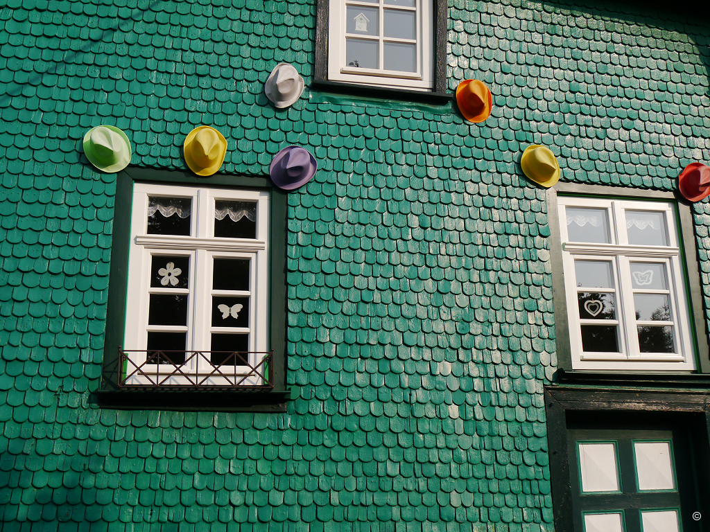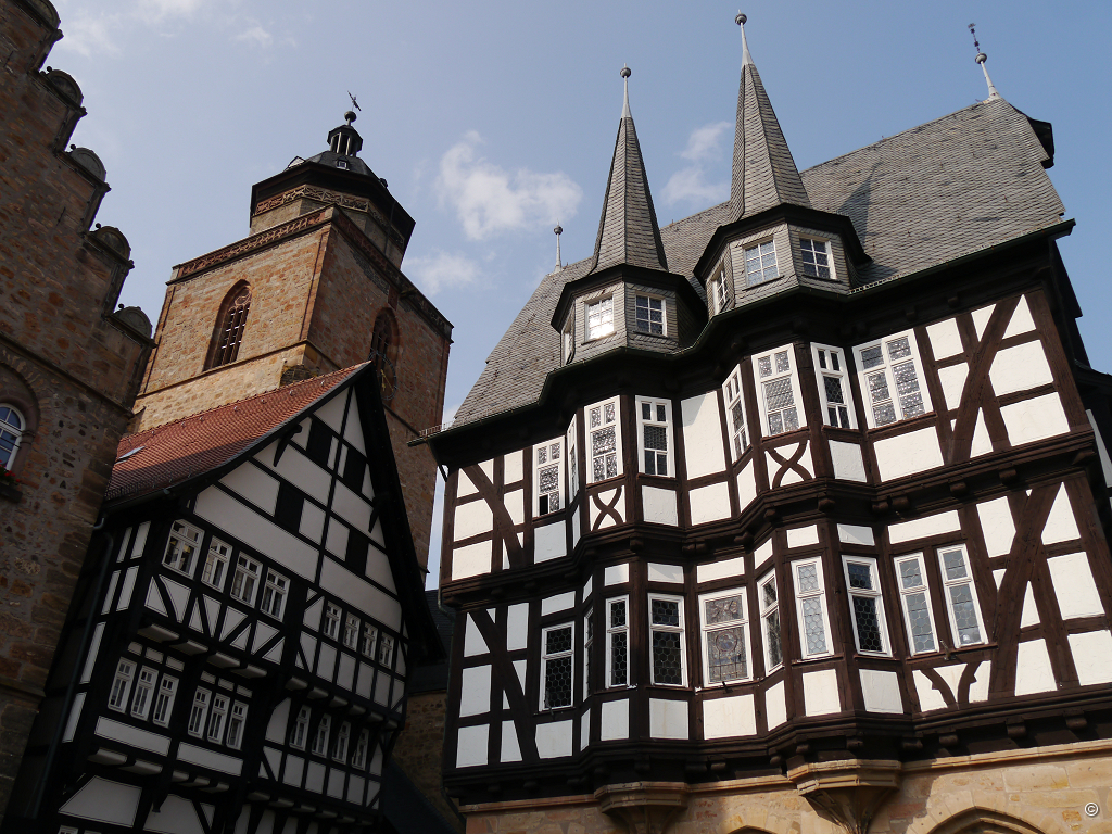 Durch Alsfeld fahre ich erst einmal nur durch, denn die Autobahn war wieder einmal sehr Baustellen lastig und ich damit zeitlich in Verzug. Aber schön ist der Ort, der schon seit 800 Jahren das Stadtrecht besitzt. Vom Mittelalter bis in die Frühe Neuzeit war Alsfeld ein bedeutender Handelsplatz. Kein Wunder also, dass es mit über 400 Baudenkmälern aufwarten kann. Dabei geht es nicht immer bierernst zu bei der Fassadengestaltung. Ich glaube kaum, dass die männlichen Sonnenhüte als Fachwerk-Ersatz beim Denkmalschutz-Amt Anerkennung finden würden, wenn es darauf ankäme. Vielleicht ist diese spezielle Fassadenverschönerung auch nur eine Anspielung auf eine der alten Legenden zur Herkunft des Stadtnamens. Um das Jahr 1200 herum soll der Landgraf von Hessen/Thüringen einen Ausritt über den Vogelsberg gemacht haben. Auf dem Homberg-Hügel, nahe Alsfeld, blies ein starker Wind und die Kopfbedeckung des Landgrafen fiel zu Boden. “Als fällt mir der Hut vom Kopp”, war sein Kommentar. “als” war seinerzeit der oberhessische Begriff für “immerfort”. Aus “als fällt” wurde dann angeblich “Alsfeld”.