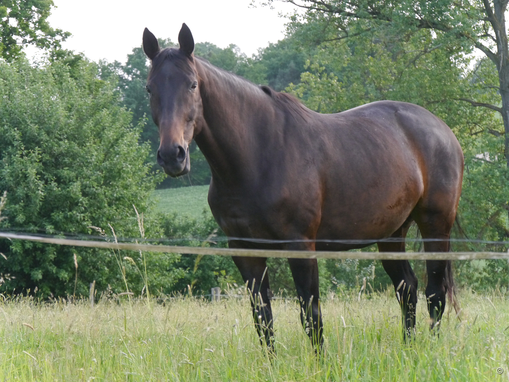 Je mehr ich mich dem Berfhof nähere, umso enger wird die Straße. Die Bäume rücken immer näher, bis sich nach 4 Kilometern der Wald öffnet und als Rahmen für fruchtbare Äcker und Weiden zurücktritt. Schön ist es hier! Ich entdecke mitten in der Fahrstraße einen großen Klecks weißen Klee. Glücklich ist, wer hier wohnt, denke ich und werde vom Pferd des Nachbarn von Jörg beäugt.