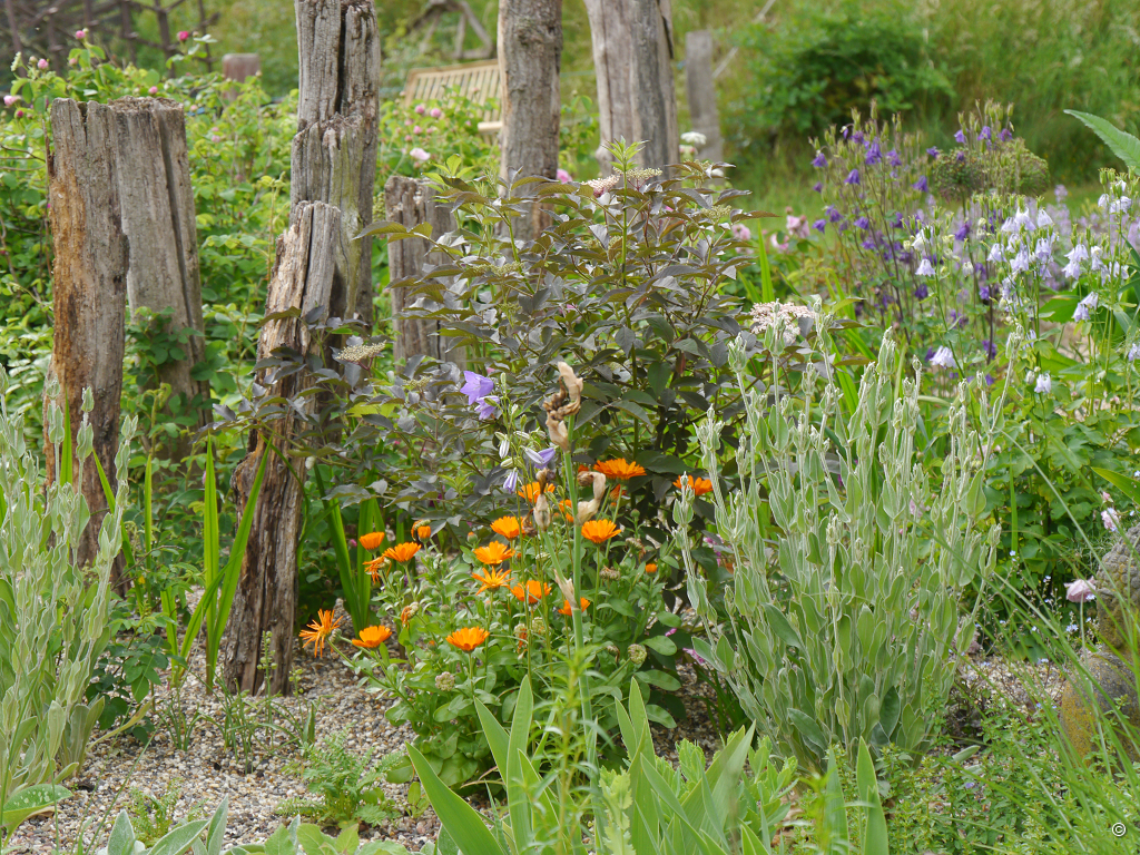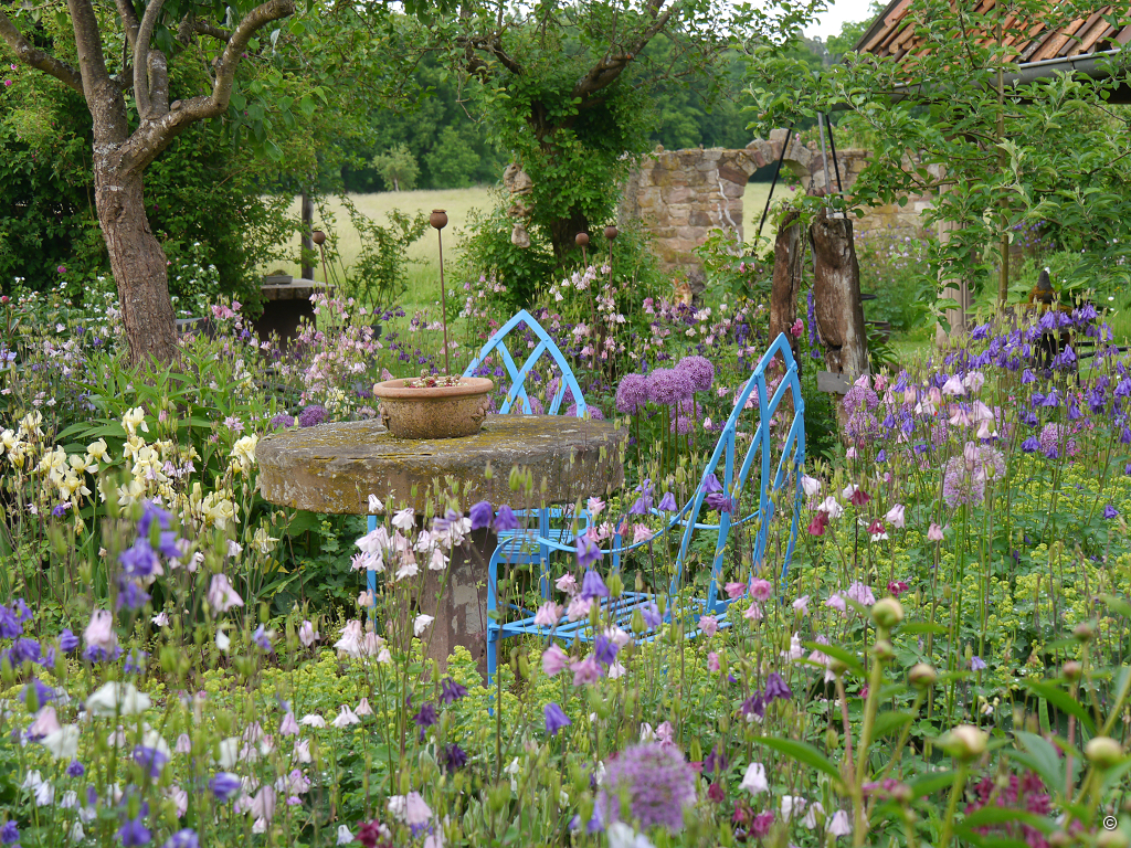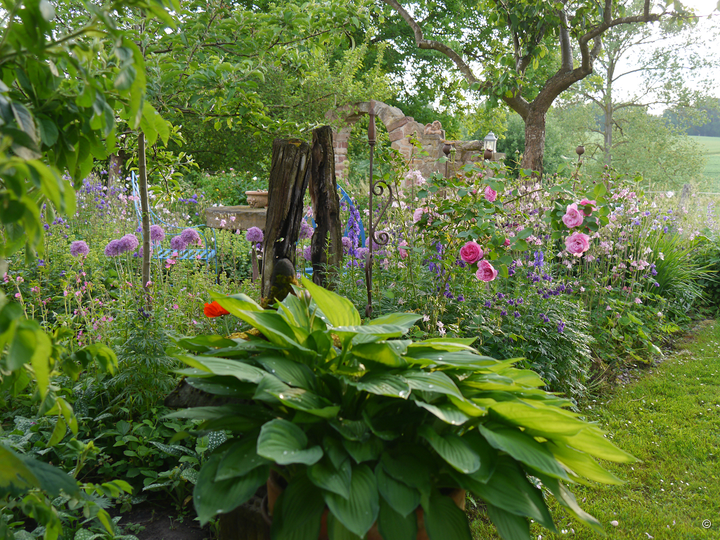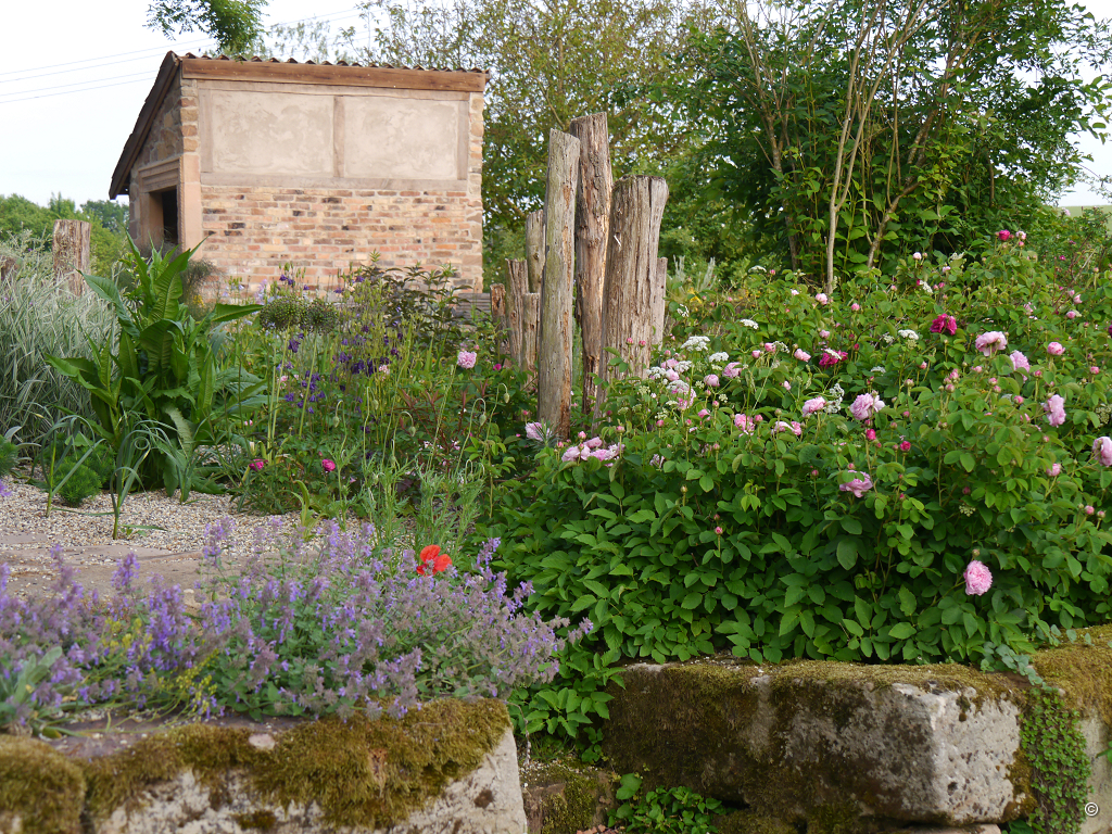 Vom Bereich des Küchengartens, über den Sitzplatz, die Feuerstelle, bis hinter zur langen Ruine herrscht eine besondere, heiter positive Stimmung, die zusammen mit der romantischen Atmosphäre jeden glücklich machen kann, der für solche Plätze sensibilisiert ist. Kein Wunder, dass hier eine weitere Lieblingsstelle der Gastgeber ist. Rotlaubige Gehölze wie Sambucus nigra ‘Black Lace’ und Cercis canadensis ‘Forest Pansy’, sorgen für etwas Magie im Garten. Für die Romantik sind die vielen historischen Rosen zuständig. Die Leichtigkeit und Heiterkeit im Garten entsteht durch die Staudenvielfalt von Akeleien, Eisenkraut, Storchschnäbeln, Stockrosen, Witwenblumen, unterschiedlichen Mohnarten und vielen mehr.