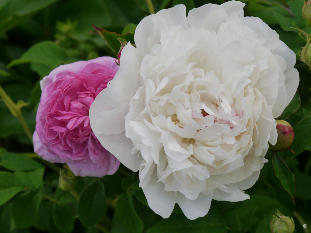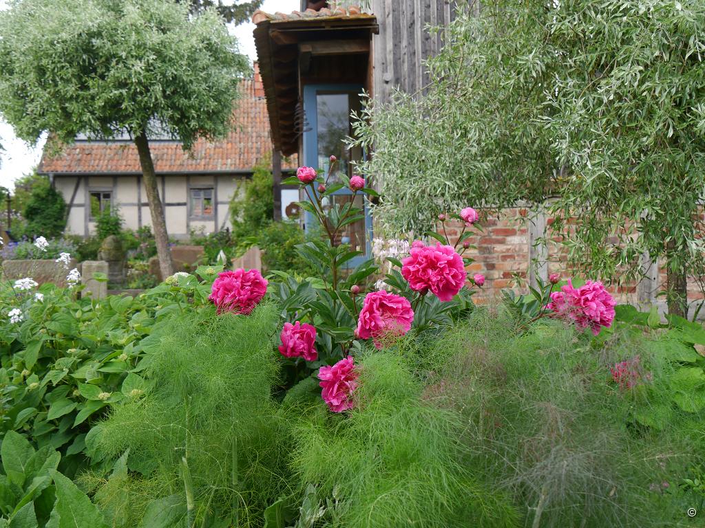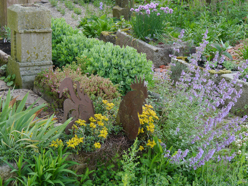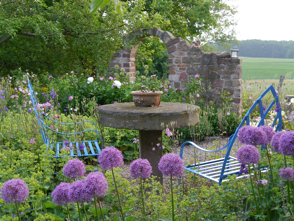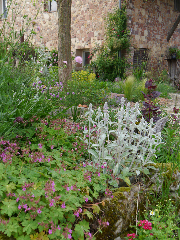 Vom Bereich des Küchengartens, über den Sitzplatz, die Feuerstelle, bis hinter zur langen Ruine herrscht eine besondere, heiter positive Stimmung, die zusammen mit der romantischen Atmosphäre jeden glücklich machen kann, der für solche Plätze sensibilisiert ist. Kein Wunder, dass hier eine weitere Lieblingsstelle der Gastgeber ist. Rotlaubige Gehölze wie Sambucus nigra ‘Black Lace’ und Cercis canadensis ‘Forest Pansy’, sorgen für etwas Magie im Garten. Für die Romantik sind die vielen historischen Rosen zuständig. Die Leichtigkeit und Heiterkeit im Garten entsteht durch die Staudenvielfalt von Akeleien, Eisenkraut, Storchschnäbeln, Stockrosen, Witwenblumen, unterschiedlichen Mohnarten und vielen mehr.
