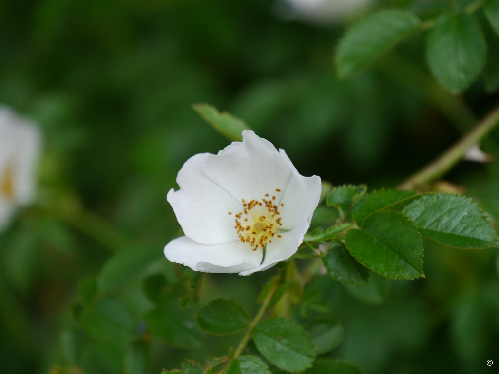 An der Ruine blüht die Zimtrose, Rosa majalis ‘Foecundissima’. Auch wenn das wie eine Einladung wirkt, so lassen sich Rehe und Wildschweine eher selten im Garten sehen. Nur einmal haben sich die Wildschweine bei Jörg und Petra unbeliebt gemacht, als sie marodierend die Wiese durchgeackert haben und sich über Gebühr an den Blumenzwiebeln vergriffen haben. Aber wie man auf dem Foto sieht, bringt die Beiden nichts so schnell aus der Ruhe. Wenn man etwas in diesem Garten lernen kann, dann ist es Gelassenheit.