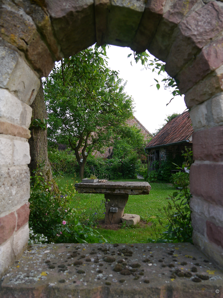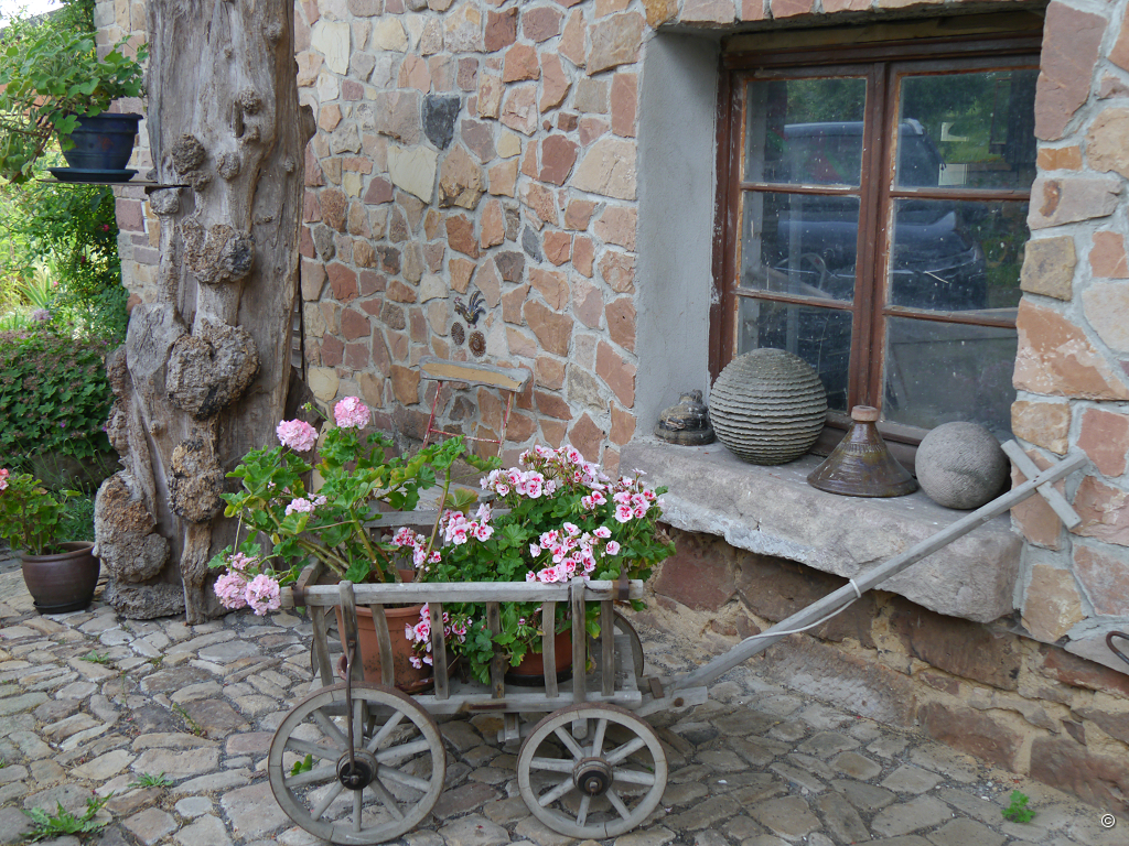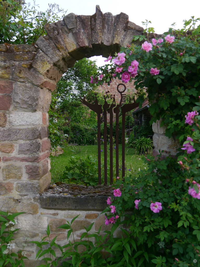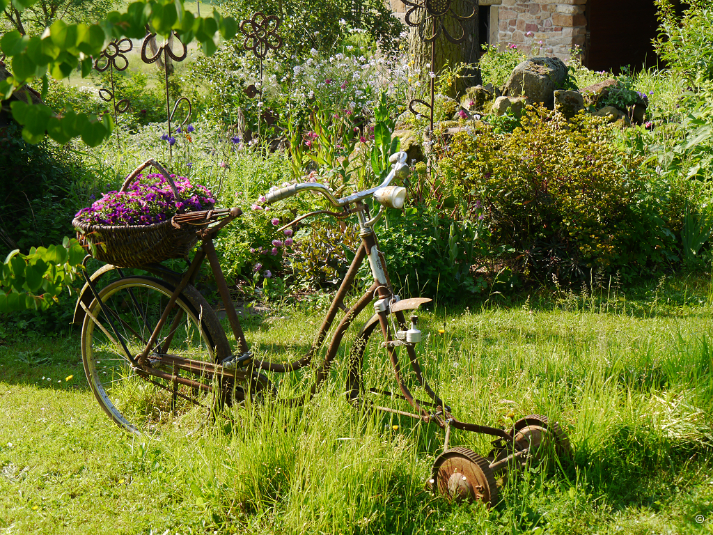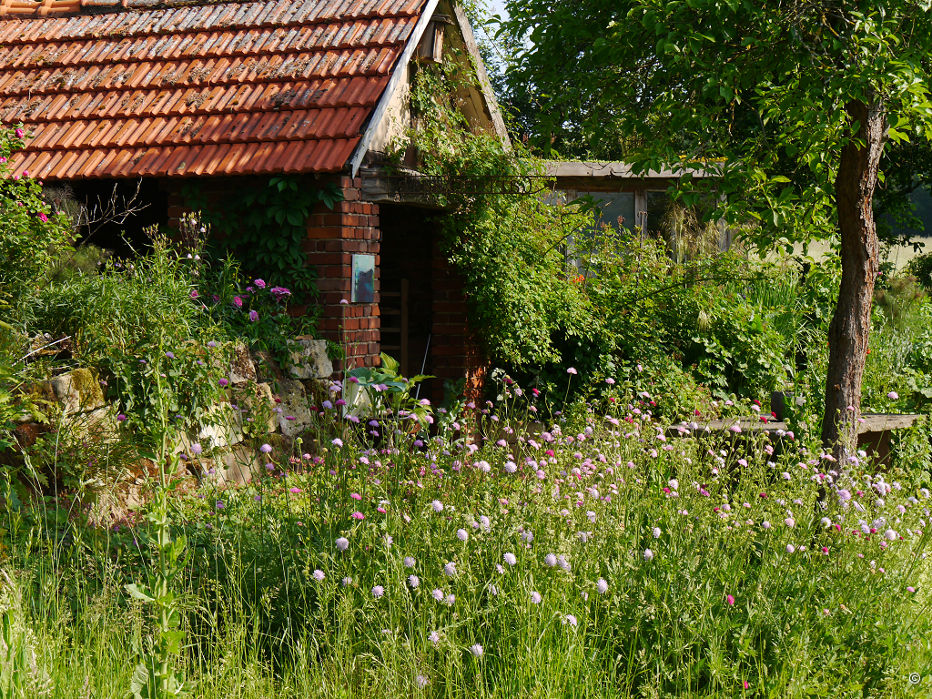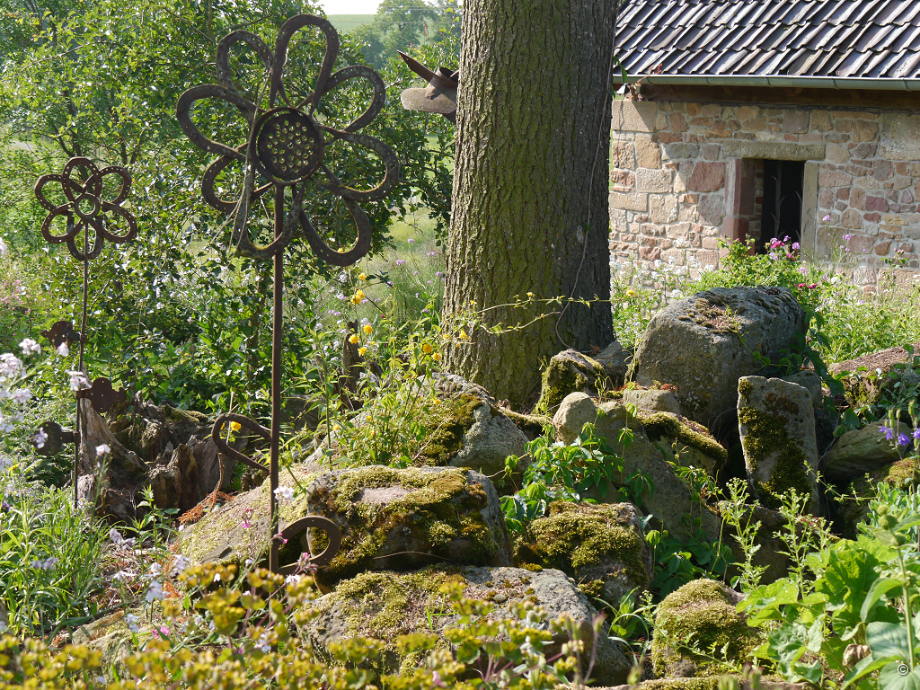 Angeregt durch viele Gartenbesuche im In- und Ausland entstand hier ein Garten mit vielen unterschiedlichen Facetten. Jörgs handwerkliches Geschick kreierte einen Fahrrad-Rasenmäher, der sich als Dekoration in der Wiese gut macht. Aber es entstanden neben den schon erwähnten Natursteinmauern auch Ruinen und Gebäude, die unterschiedliche Funktionen haben. Optisch gliedern sie als Abgrenzungen oder Enden von Sichtachsen das weitläufige Areal. Da sich in einem Naturgarten schnell einmal die Konturen etwas verwischen, sind diese Konstanten mehr als wichtig. Neben dem Teich befindet sich das Backhaus, da wächst die Rose ‘Jeanne du Volcan’, gezüchtet von Rudolf Bergmann in Lauterbach und zu Ehren des Vogelsbergs, so genannt. Dahinter sieht man das begrünte Dach des ehemaligen Hühnerhauses. Seitdem sich Habicht, Fuchs, Marder und Waschbären im Hühnerhof bedient haben, ist das Häuschen leer und dient zur Pflanzenüberwinterung.