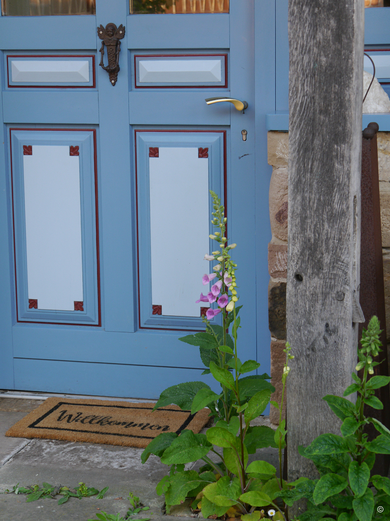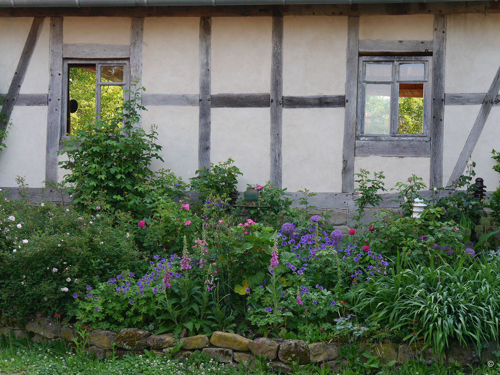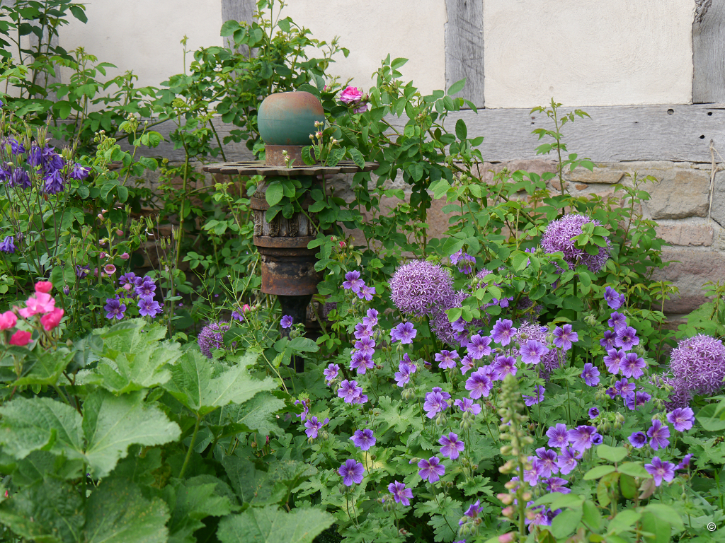 Ich habe noch Zeit vor der Abfahrt in die Gärten, die ich heute besuchen möchte und laufe mit der Kamera durch den Innenhof zur potemkinschen Fachwerk-Front mit einem dekorativen, vorgelagerten Mixed-Border. Auch hier geht es natürlich nicht ohne Rosen. Zusammen mit den blauen Storchschnäbeln und großen Allium-Bällen ist hier ein romantisches Blumenbeet entstanden.