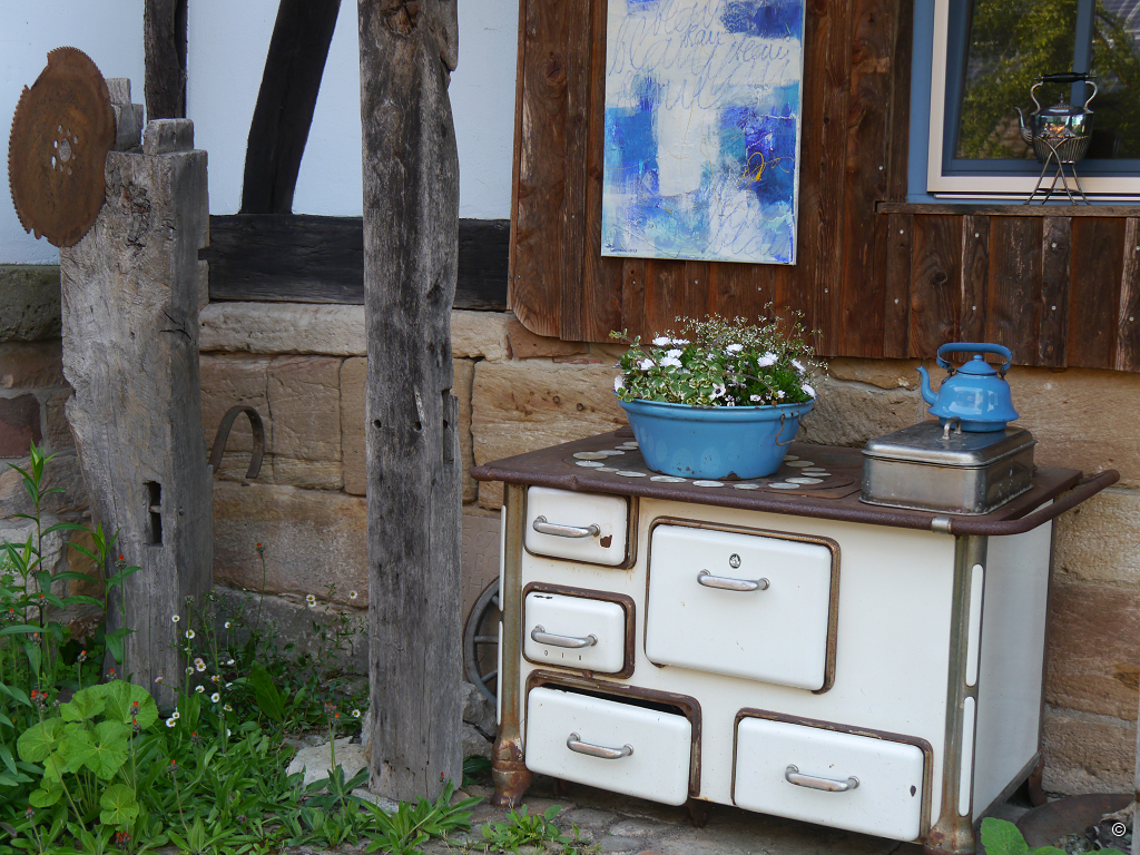 Bei der Auffahrt in den Innenhof lacht mir schon Ulrike entgegen. Kein Wunder, sie ist mir 1 Stunde Anwesenheit, 2 Tassen Kaffee und 2 Stück Kuchen voraus. Dann lerne ich endlich Jörg Diebel und Petra Neumann kennen. Sie bringen mich gleich durch den Garten nach hinten zu ihrer Lieblingssitzecke in der Nähe des Feuerplatzes und ich kann zumindest das Defizit an Kaffee und Kuchen schnell aufholen. Auch den Abend verbringen wir hier und ich verspüre das erste Mal den besonderen, romantischen Esprit des Gartens.