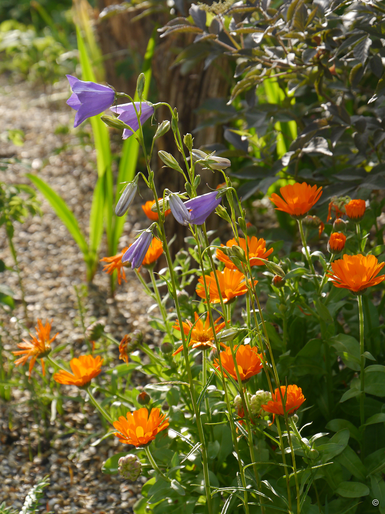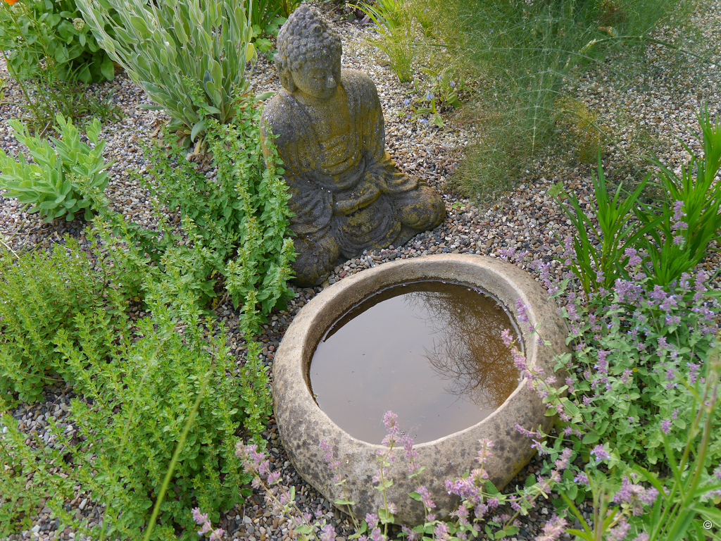 Jörg beobachtet mich bei meinen morgendlichen Yoga-Übungen. Möglichst ohne zu wackeln in die Knie zu gehen, um den Ringelblumen, Euphorbien, Glockenblumen, Thymian, Bartiriden und Fingerhüten näherzukommen, ist gar nicht so einfach. Unvermittelt kommt seine Frage, was ich sehe, als ich vor der Vogeltränke mit dem Buddha stehe. Da ich den Dekofisch im Wasser nicht sehe, schaue ich etwas ratlos bei seiner Aufklärung: “Butter bei die Fische” (von Jörg augenzwinkernd umgedeutet in “Buddha bei die Fische”). Natürlich kenne ich die norddeutsche Redewendung, darum komme ich auch gleich wieder zur Sache und fotografiere weiter.