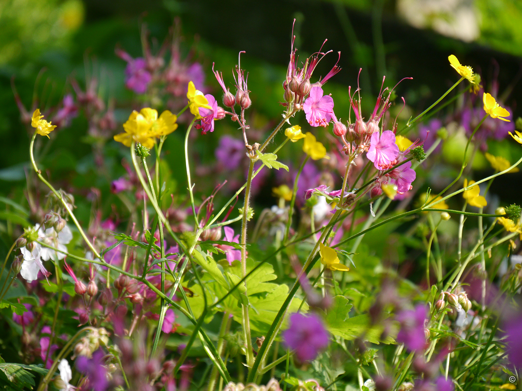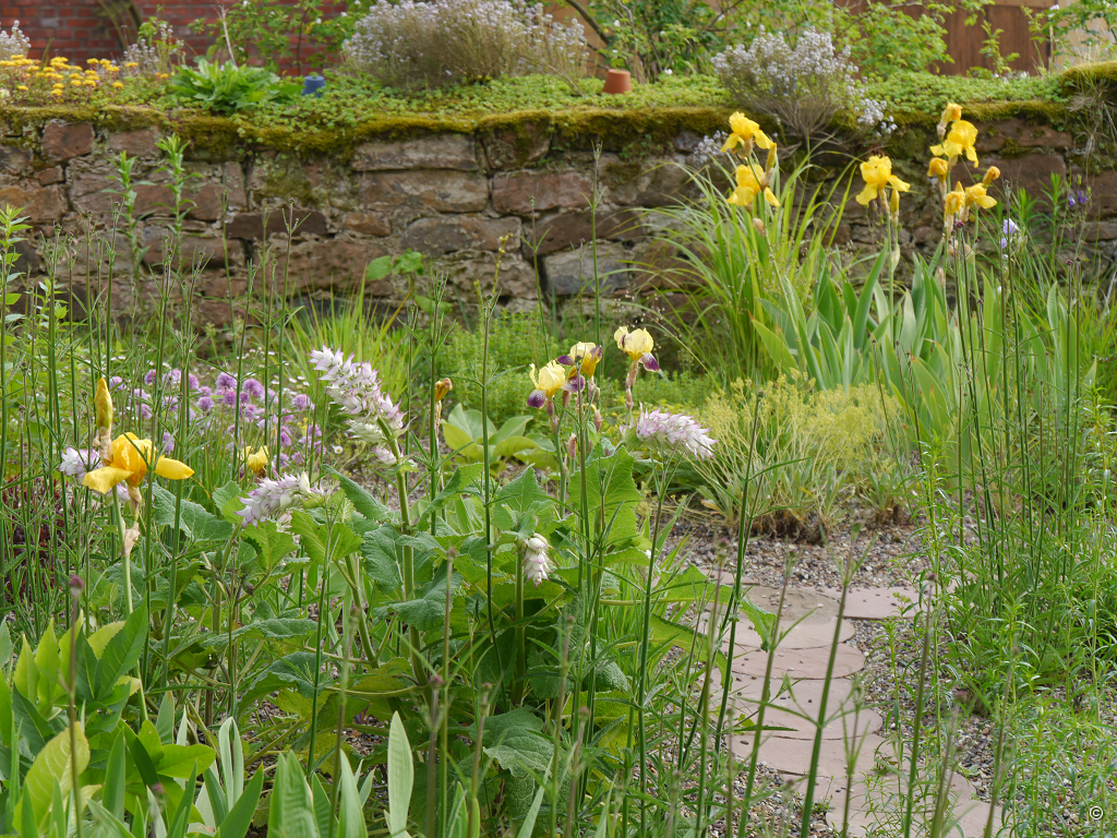 Mauerbeet, Stumpery, Alte Rosen, Wildblumenwiesen, Teich und der Ruinengarten
