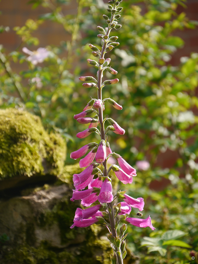 Folgt man dem Querweg bis zum Ende, kommt man in die Kinderstube von Jörg, der keine überzähligen, lebenden Pflanzen wegwerfen mag. Viele kleine Töpfe wechseln an den Tagen der “Offenen Gartentür” den Besitzer. So leeren sich die Pflanztische so schnell, wie sie wieder aufgefüllt werden. Mich interessiert die Natursteinmauer mit der bepflanzten Mauerkrone, die den Hang abfängt und stabilisiert, momentan mehr. Aber am letzten Tag darf ich mir dann einige Fingerhüte aus der Kinderstube mitnehmen.