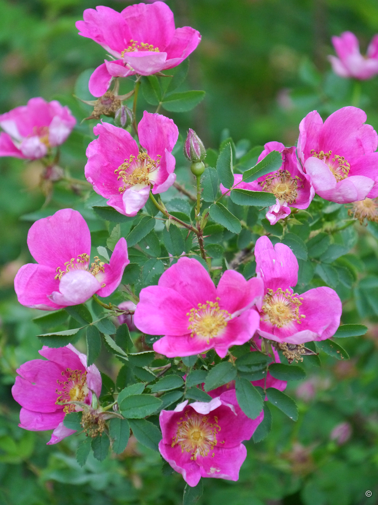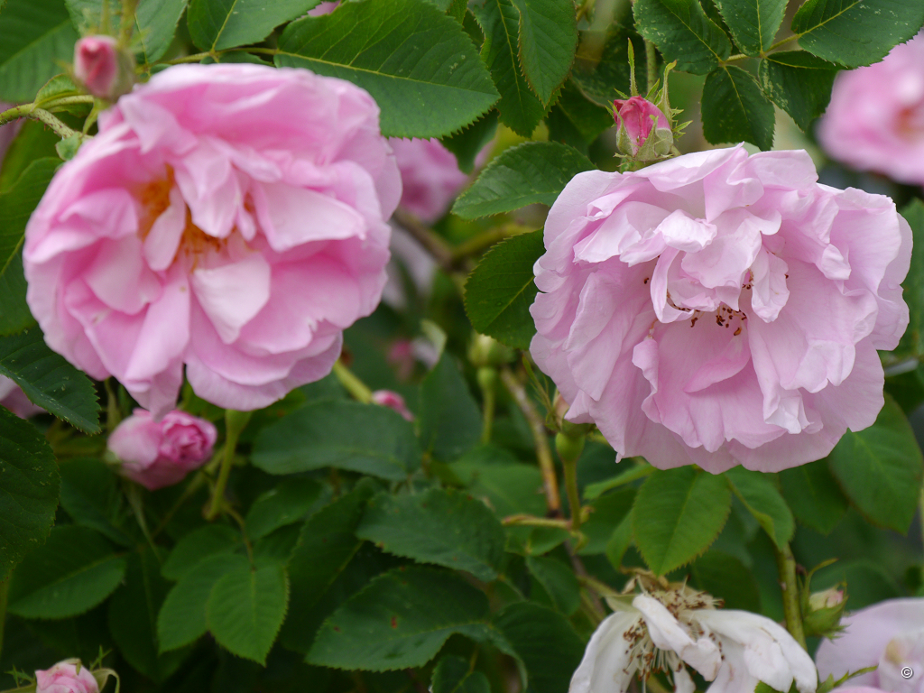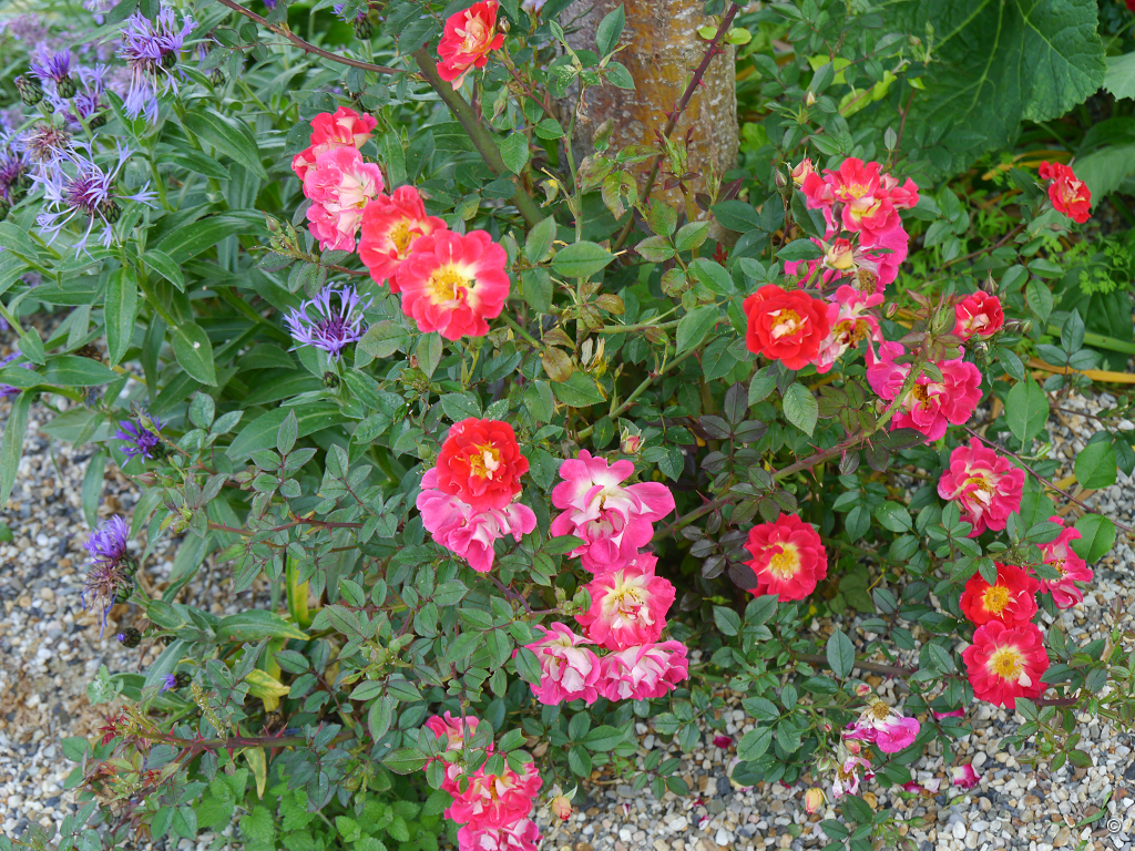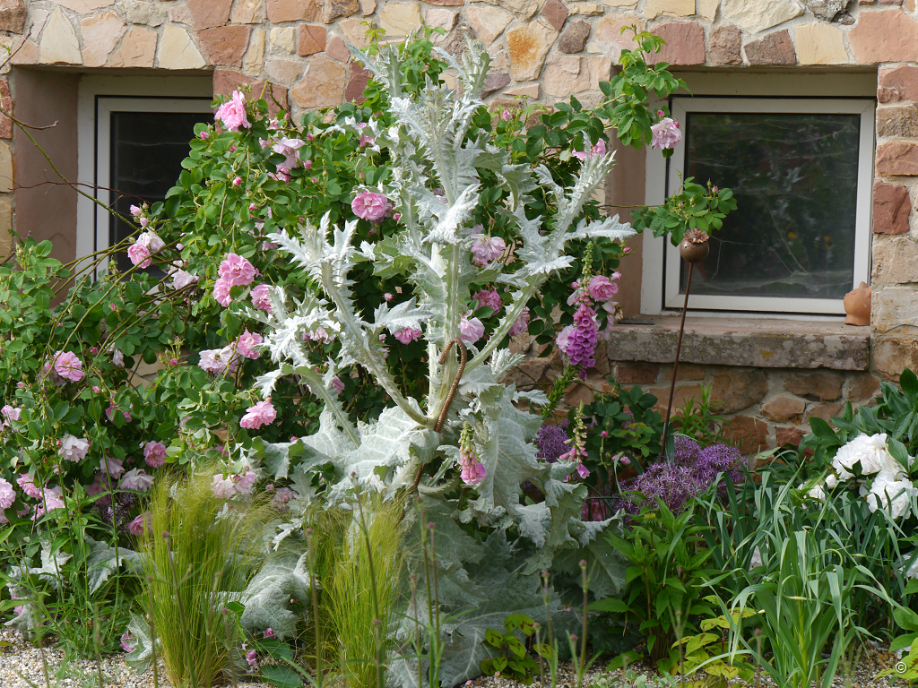 Schon beim ersten Rundgang am Vorabend war mir aufgefallen, dass Rosen eine große Rolle in diesem Garten spielen. Ausladende Rosensträucher dienen nicht nur als Abgrenzung zur Straße, sondern sind in fast allen Gartenteilen in unterschiedlichen Wuchsformen präsent. Am Rand des Kiesgartens gedeiht hinter der Eselsdistel, Onopordum acanthium, die Rosa ‘Celsiana’, eine Damaszenerrose. Vor einem der Weidepfähle, die den Kiesgarten strukturieren helfen, leuchtet eine Sorte der Rosa pimpinellifolia heraus.